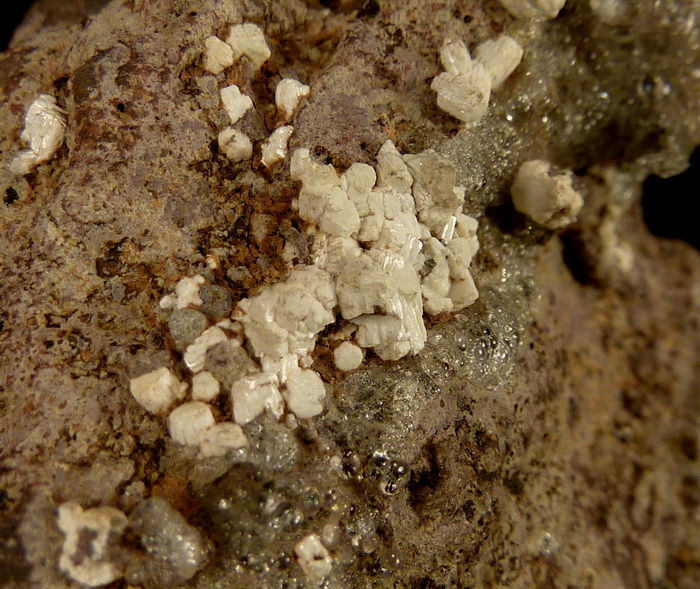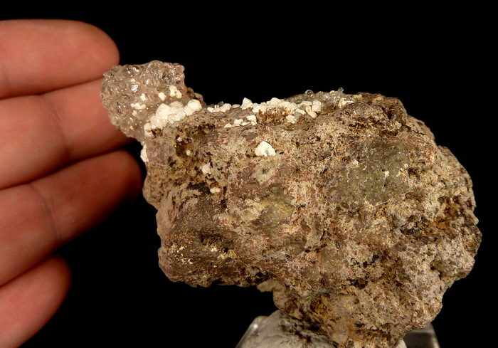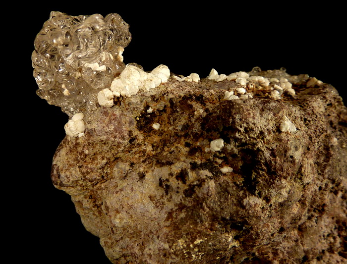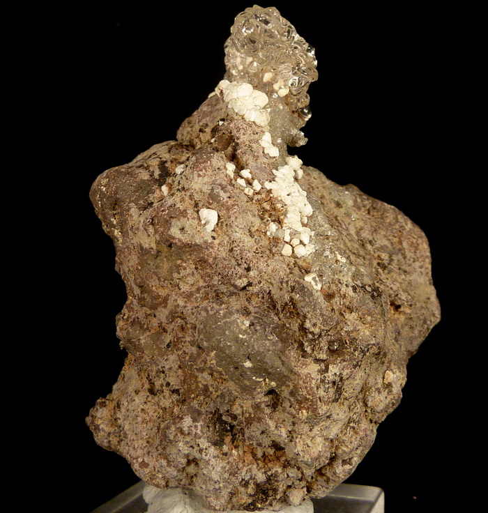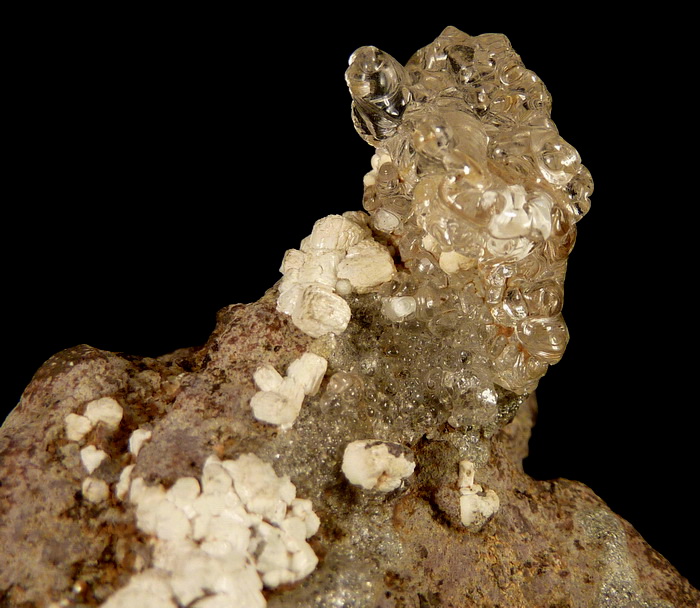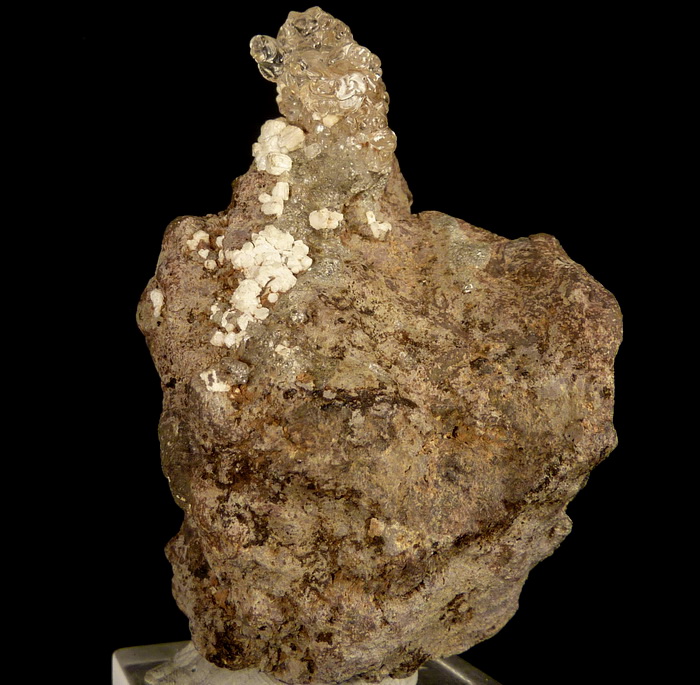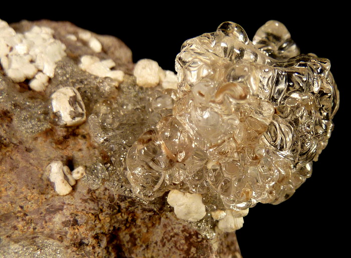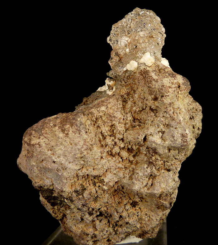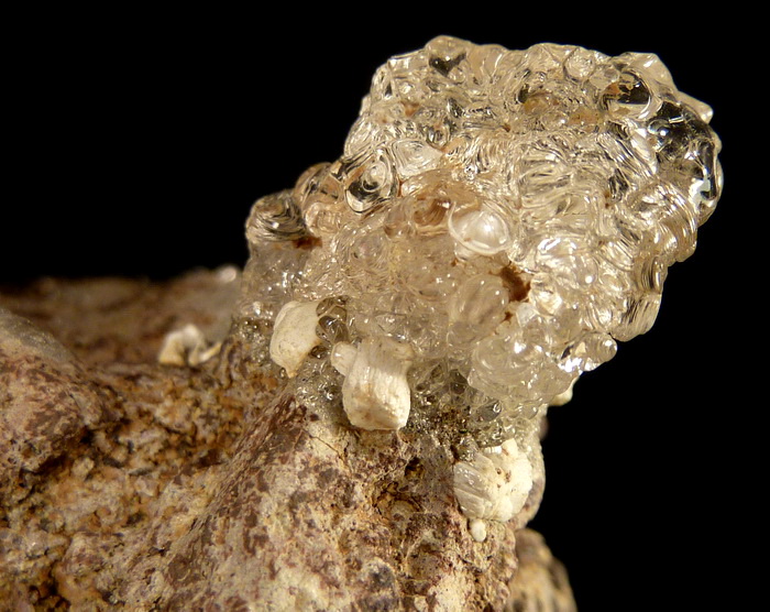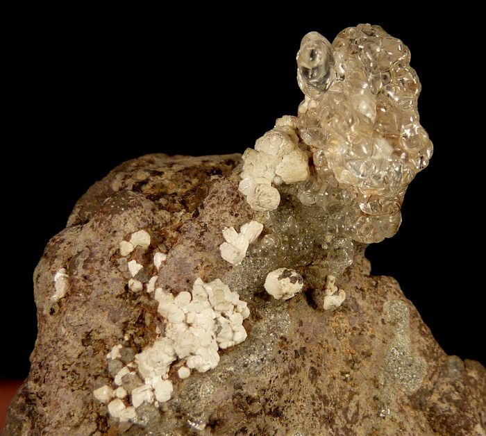Ciekawy okaz hialitu (opalu szklistego) wraz z białymi kulkami rzadkiej odmiany fluoroapatytu - staffelitem (fluoroapatyt węglanowy) na skałce z klasycznej czeskiej lokalizacji.