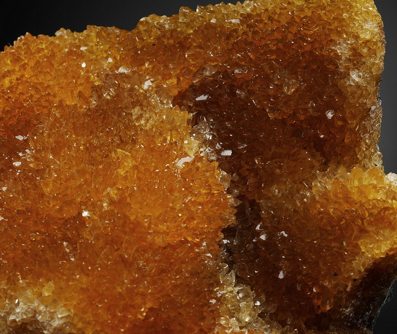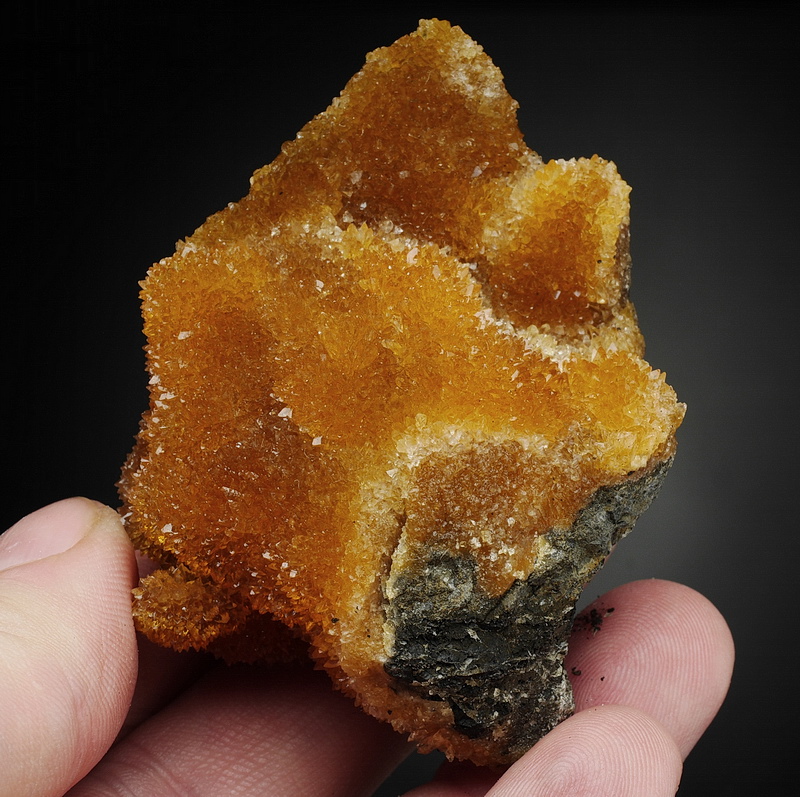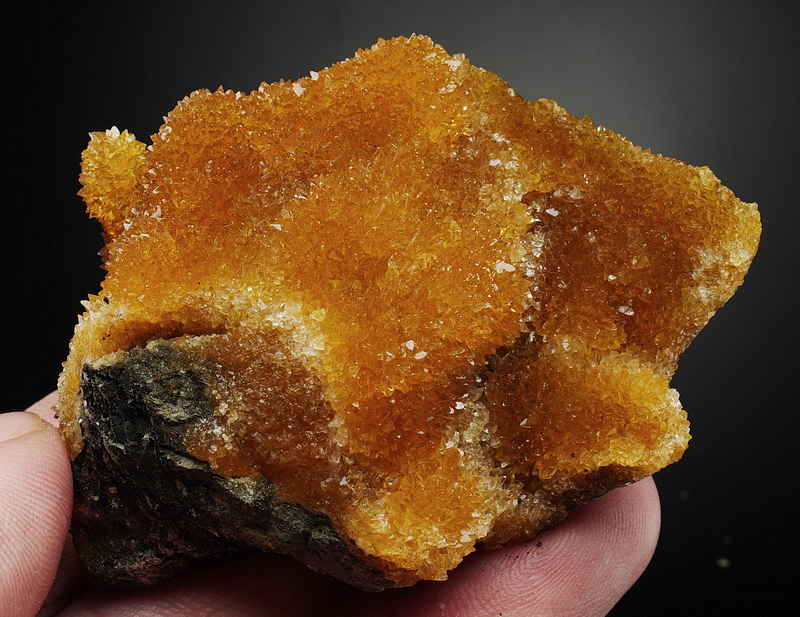 Błyszcząca szczotka kryształów kalcytu na bazalcie.