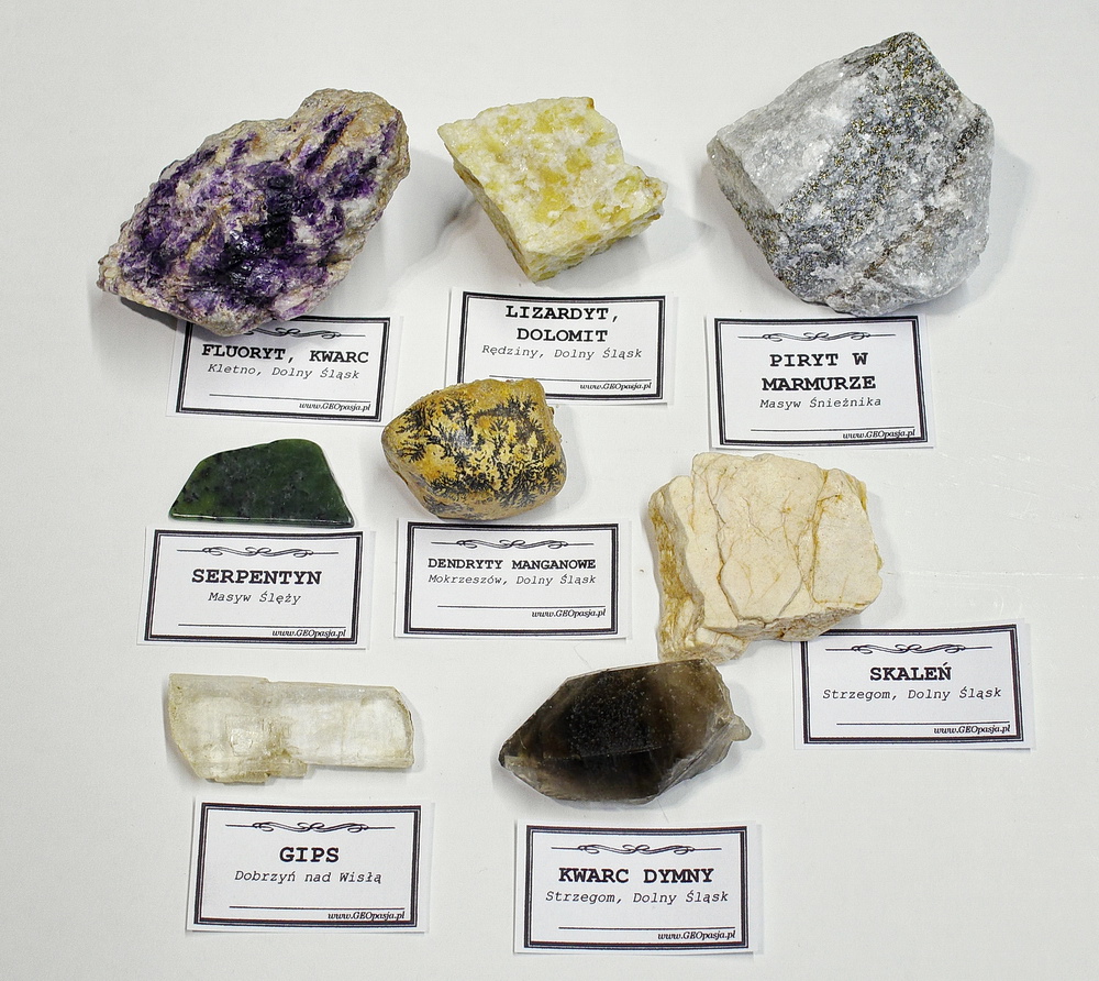 Gips - kryształ (Dobrzyń), Piryt w marmurze (Masyw Śnieżnika), kwarc dymny (Strzegom), skaleń (Strzegom), lizardyt w dolomicie (Rędziny), serpentyn (masyw Ślęży), fluoryt w kwarcu (Masyw Śnieżnika), dendryty manganowe (Mokrzeszów)
