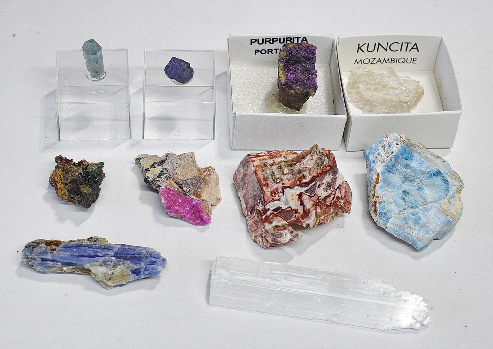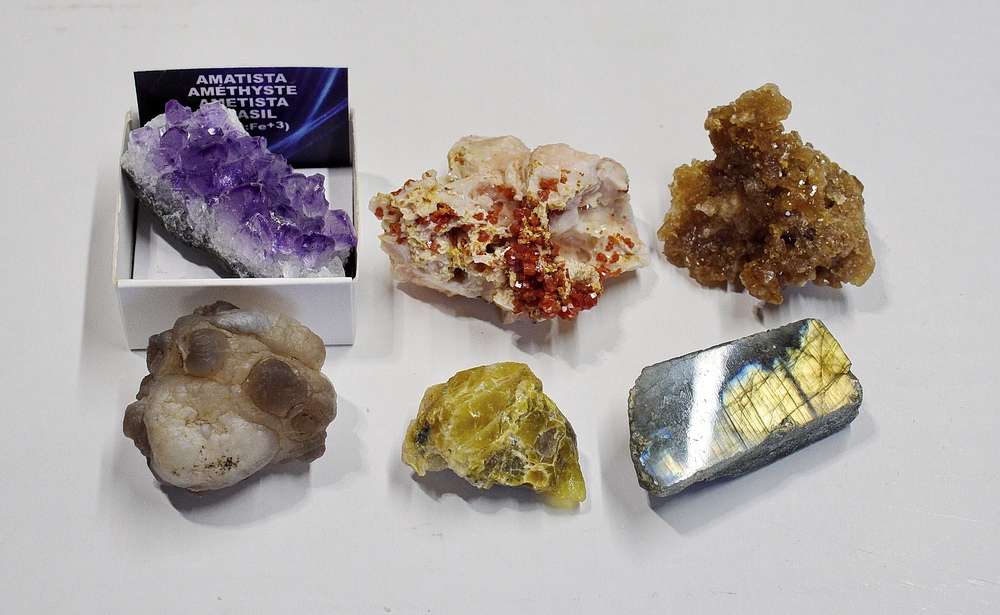 ametyst (Brazylia), labradoryt (Madagaskar), akwamaryn (Namibia), dioptaz (Kongo), tanzanit (Tanzania), kobaltoklacyt (Kongo), wanadynit (Maroko), cytryn (Maroko), apatyt (Madagaskar), kuncyt (Pakistan), gips włóknisty (Maroko), opal miodowy (Tanzania), purpuryt (Portugalia), jaspis leopardzi (Meksyk), dysten (Brazylia), chalcedon (Maroko)