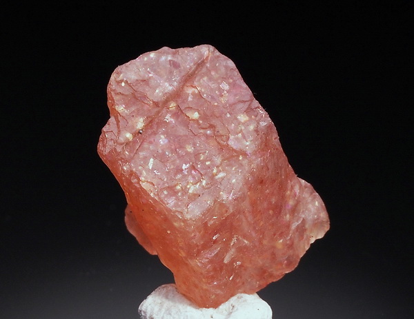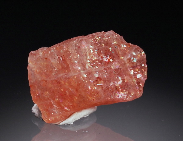 Bryłka kamienia słonecznego (skaleń awenturynowy) wykazująca migotliwą iryzację (blaszkowe inkluzje hematytu).