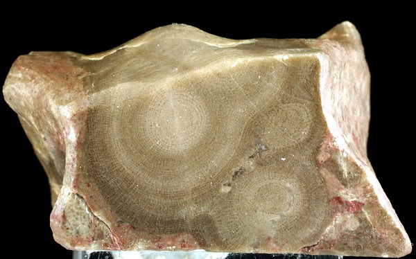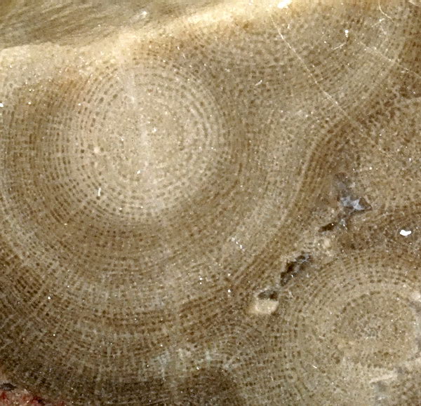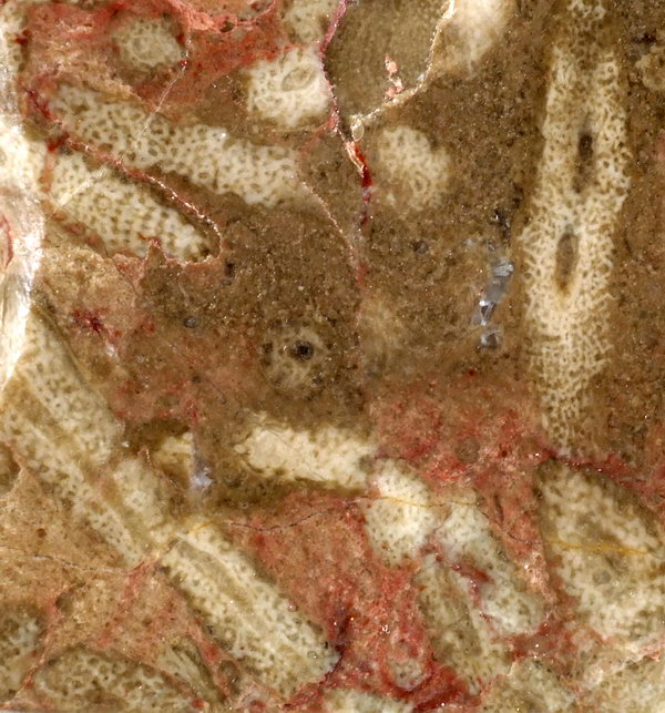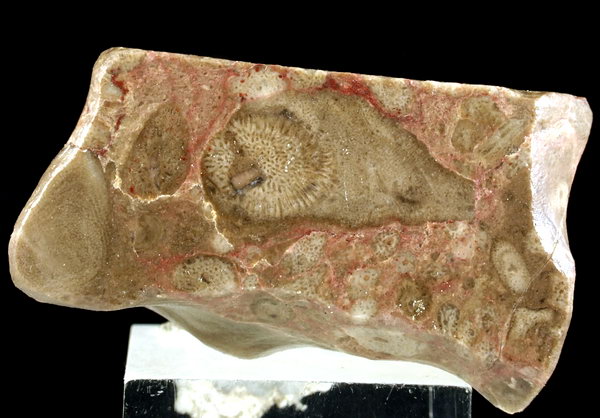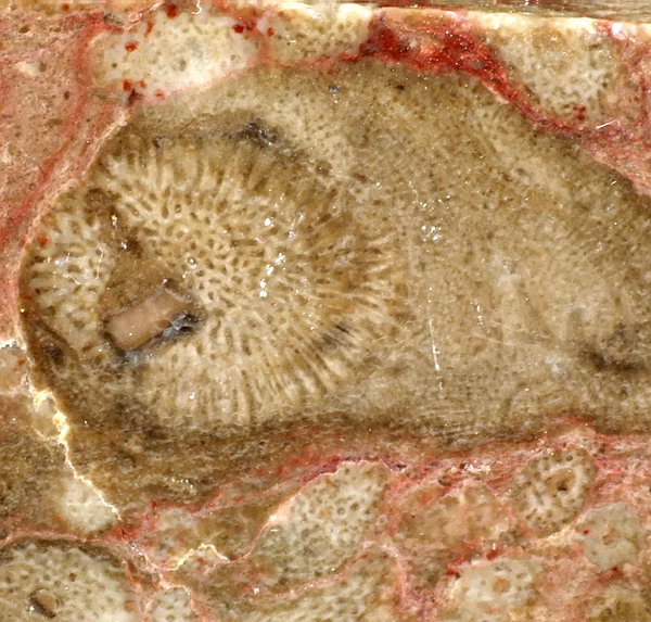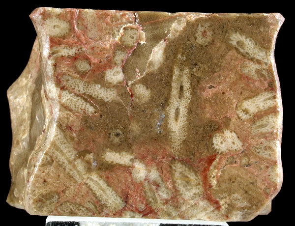 Okaz obrabionego wapienia z koralowcami, stromatoporoidami i amfiporami.