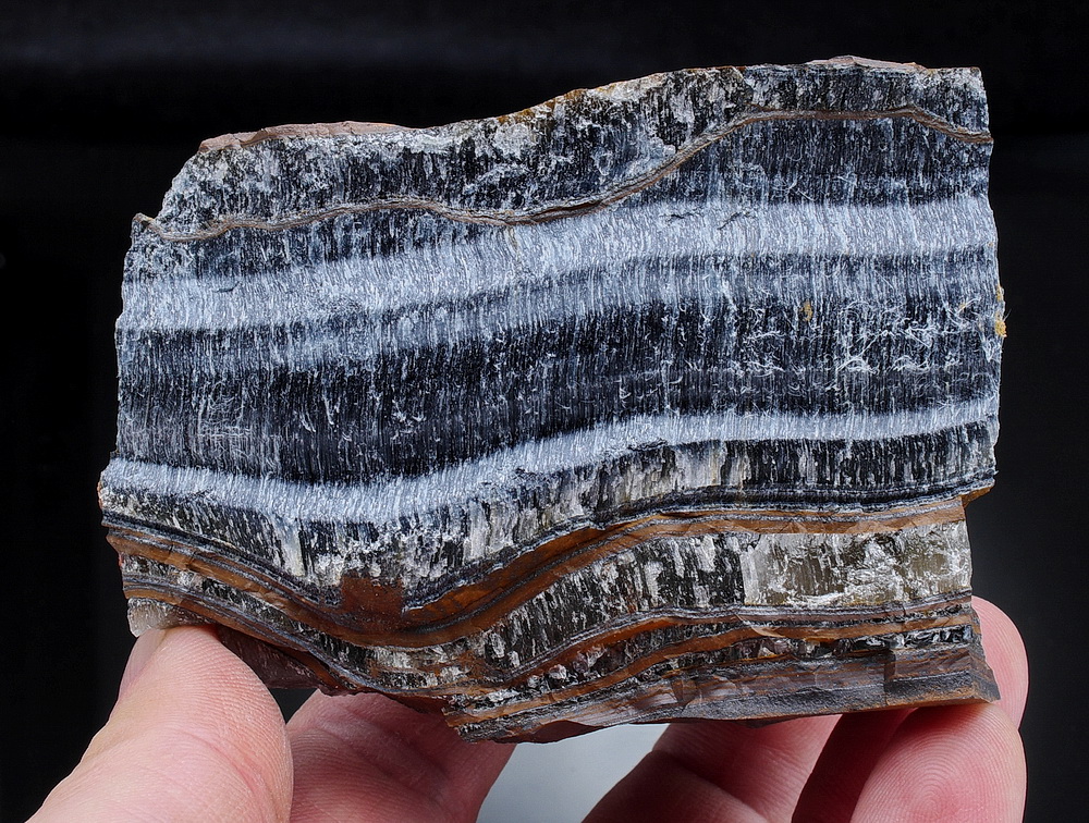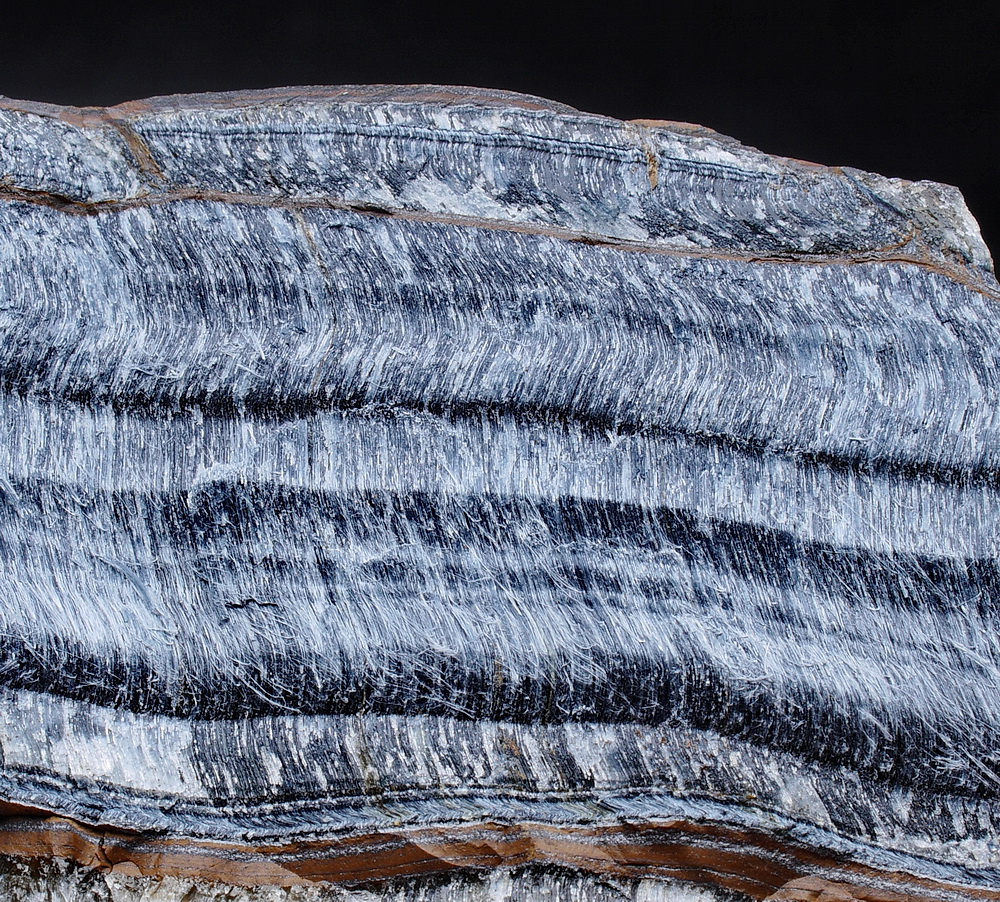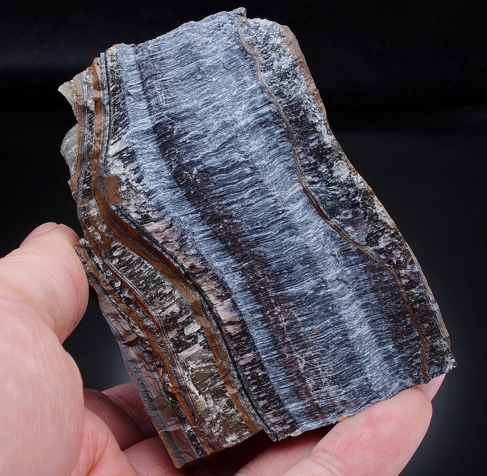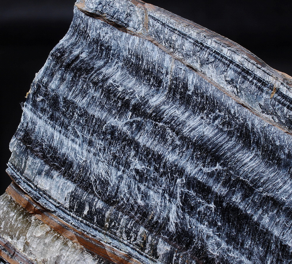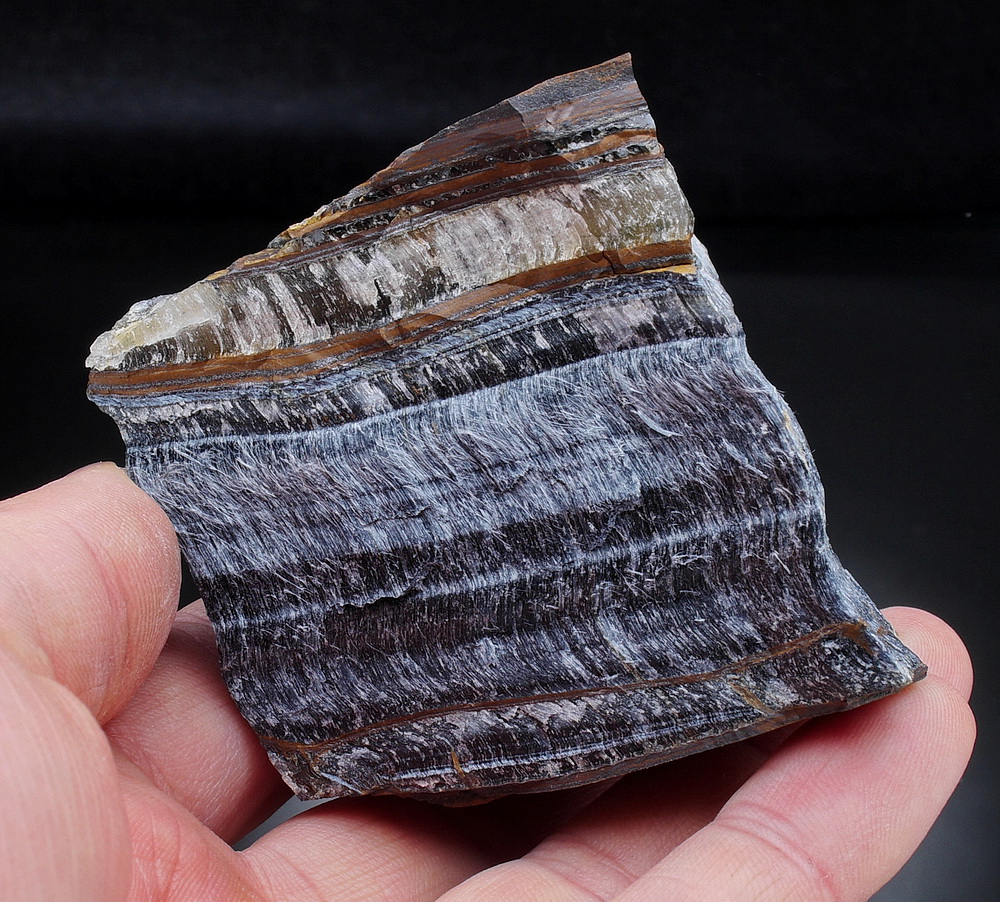 Częsciowo skrzemionkowane skupienia włóknistego krokidolitu (odmiana riebeckitu) o jedwabistym połysku o wspaniałej barwie - "SOKOLE OKO".