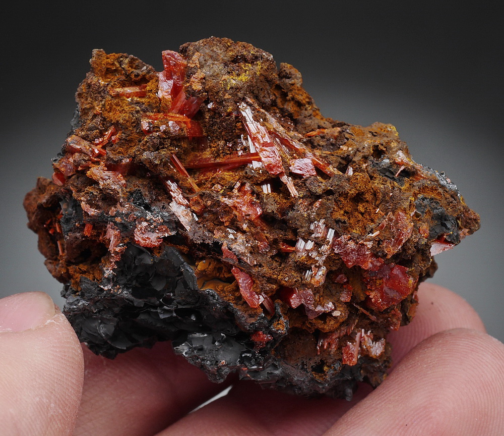 Bardzo błyszczące kryształy czerwonego krokoitu na limonicie.