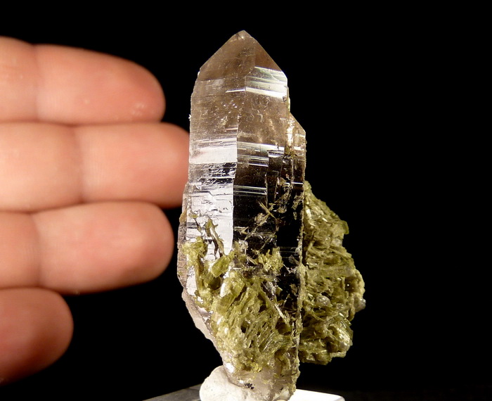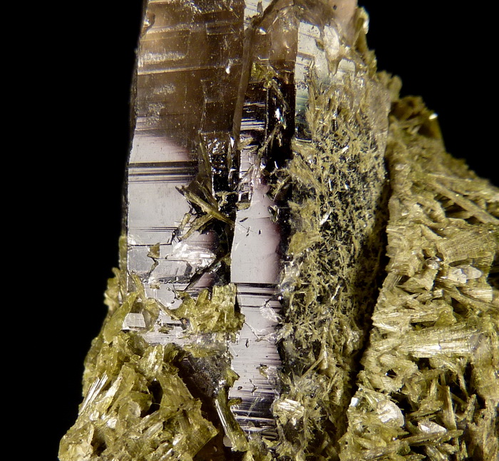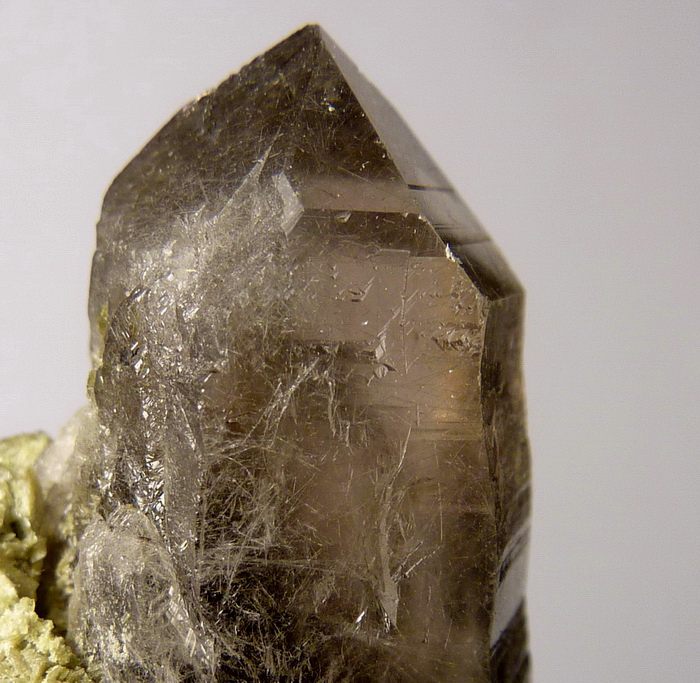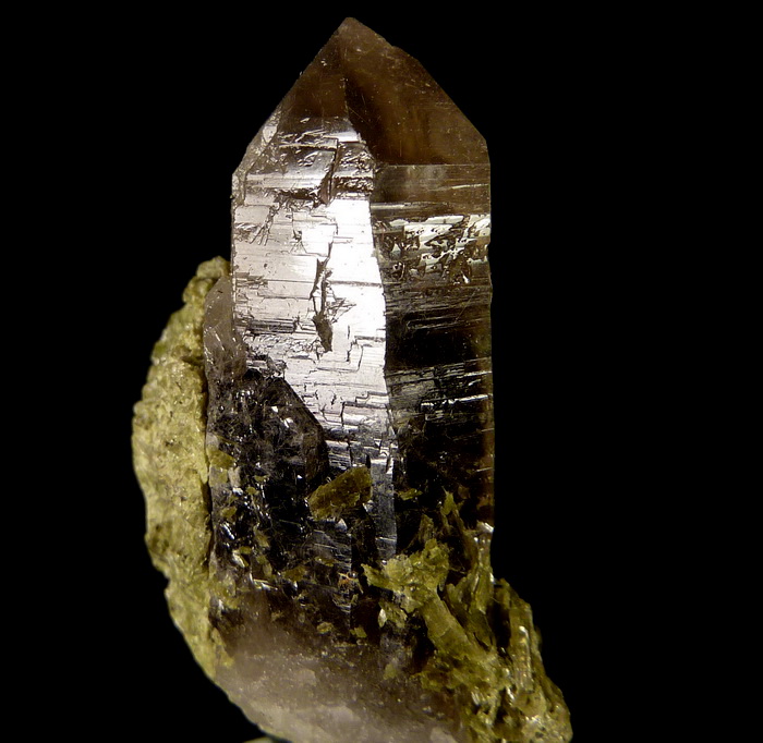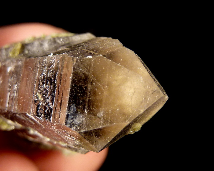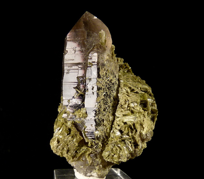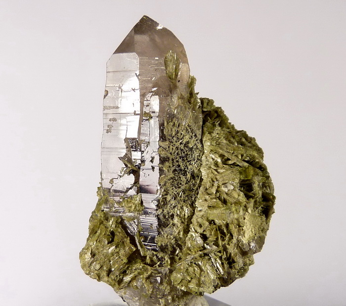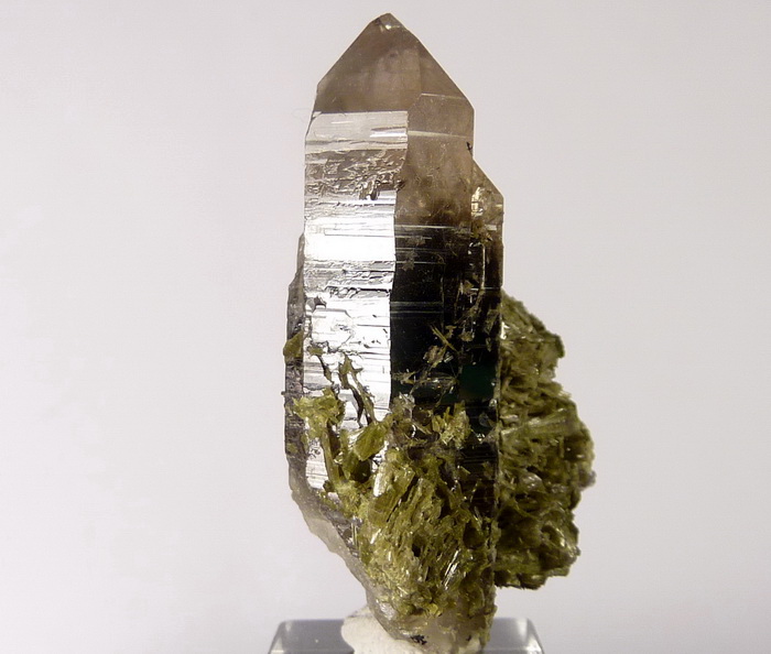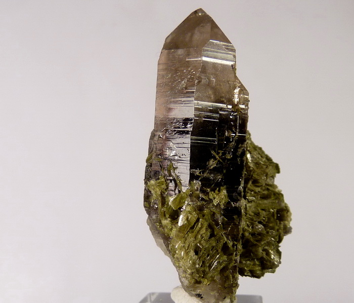 Ładnie wykształcony kryształ kwarcu dymnego wraz z zielonym epidotem oraz inkluzjami rzadkiego minerału - bavenitu.