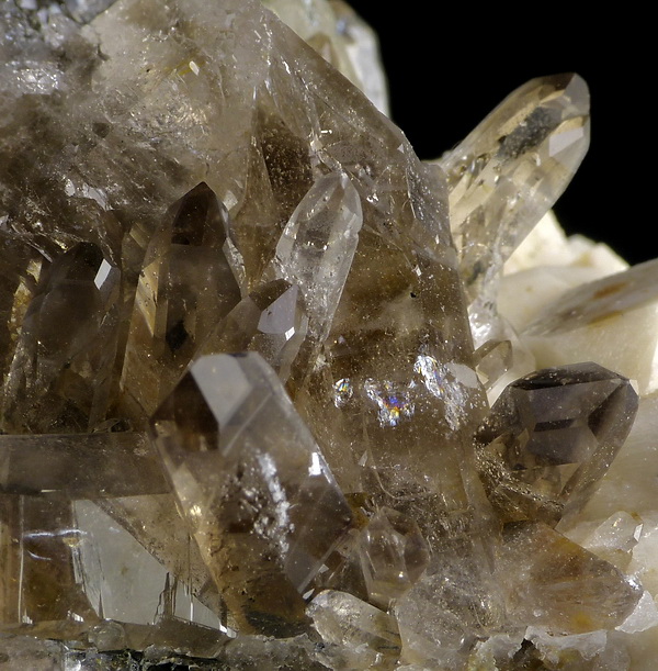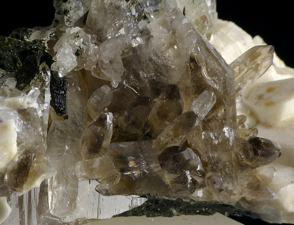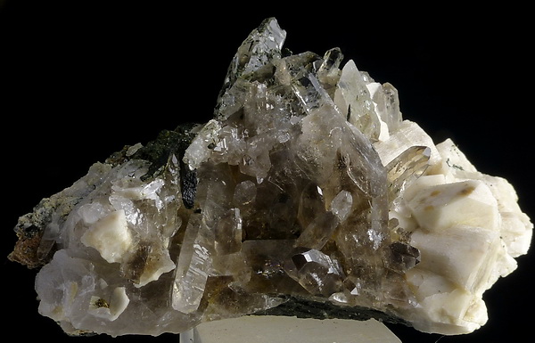 Zrost kryształów bardzo czystego kwarcu dymnego o silnym połysku z ortoklazem.