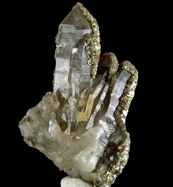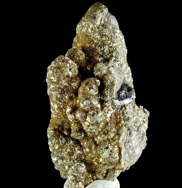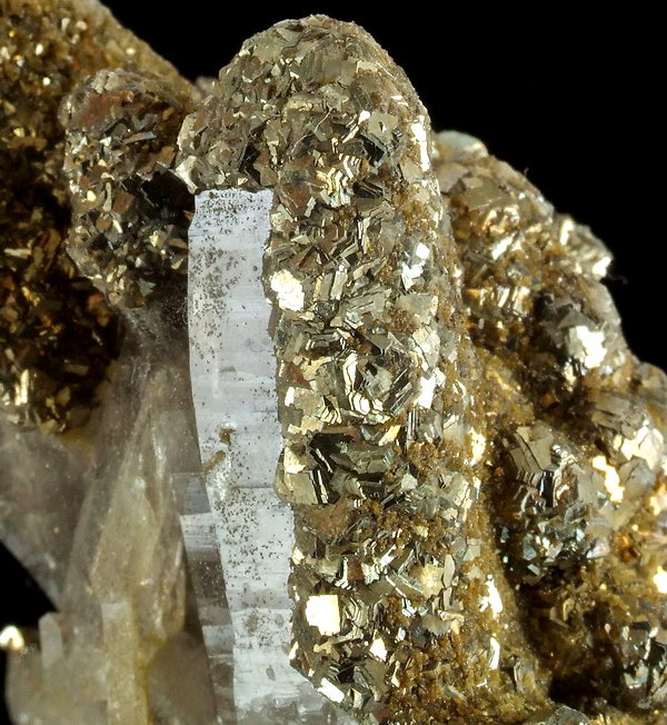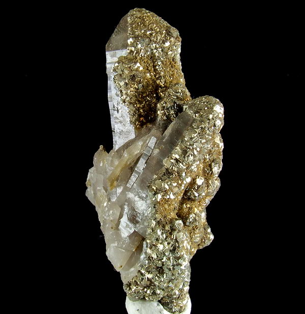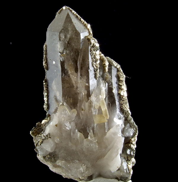 Błyszczący zrost kryształów kwarcu dymnego, częściowo pokrytego połyskującymi kryształami złocistego pirytu.