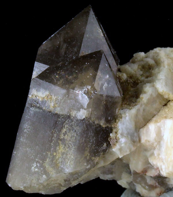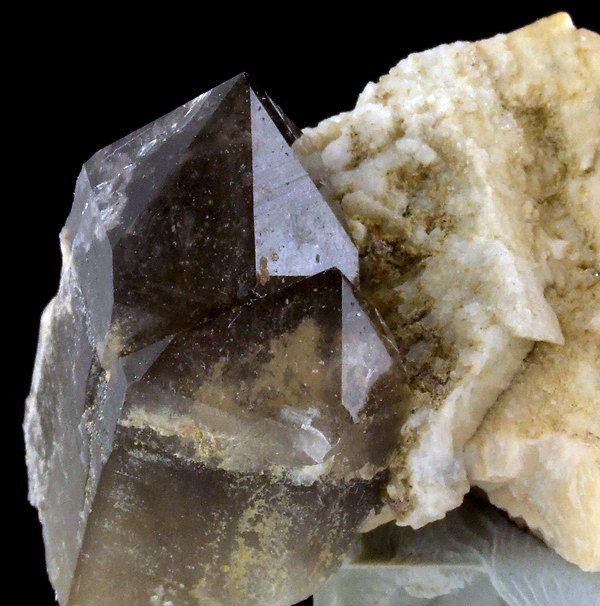 Zrost błyszczących kryształów kwarcu dymnego na mikroklinie.