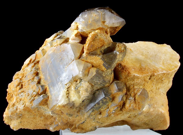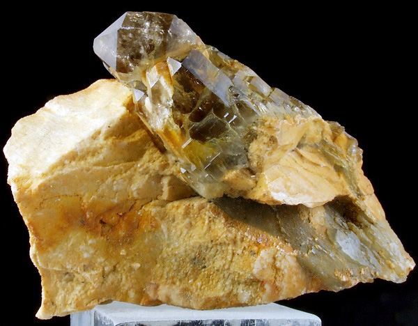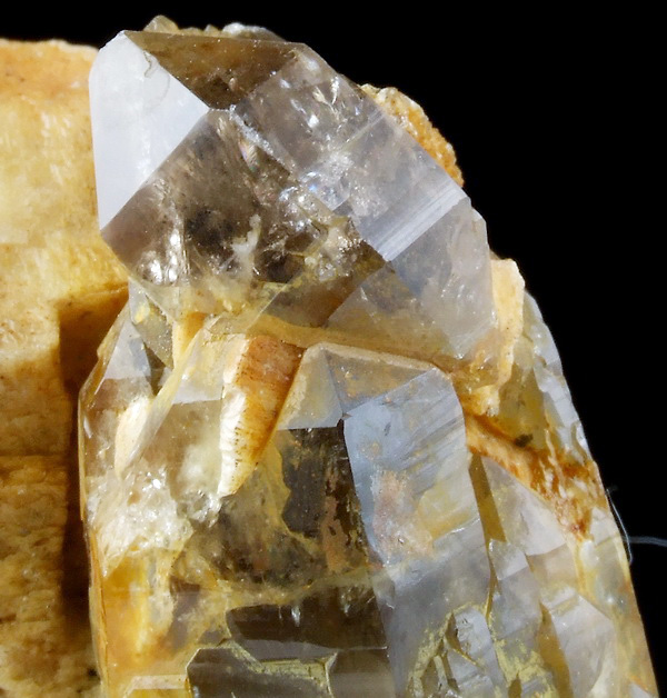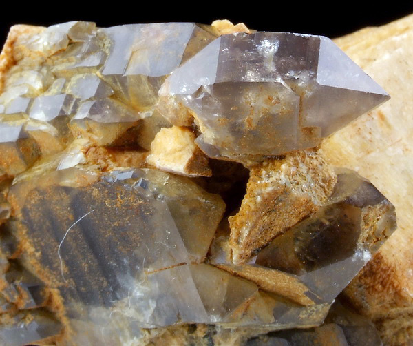 Dobrze wykształcone, szkieletowe kryształy kwarcu dymnego o błyszczących ścianach osadzone na skaleniu.