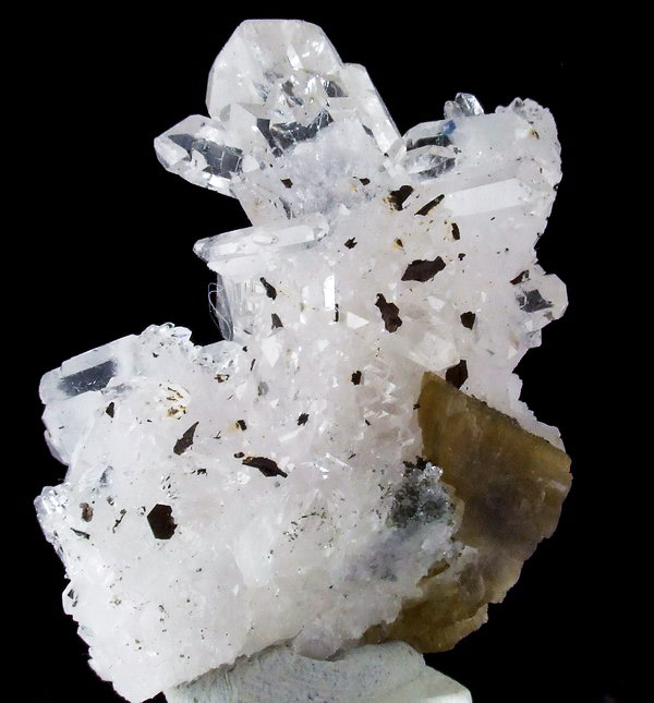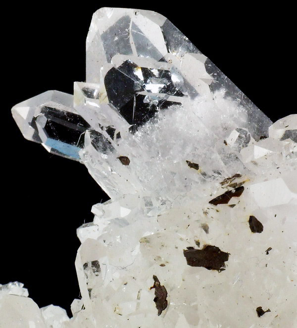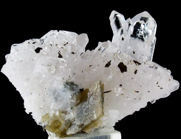 Zrost błyszczących kryształów kwarcu z pirotynem i syderytem.