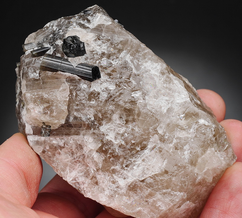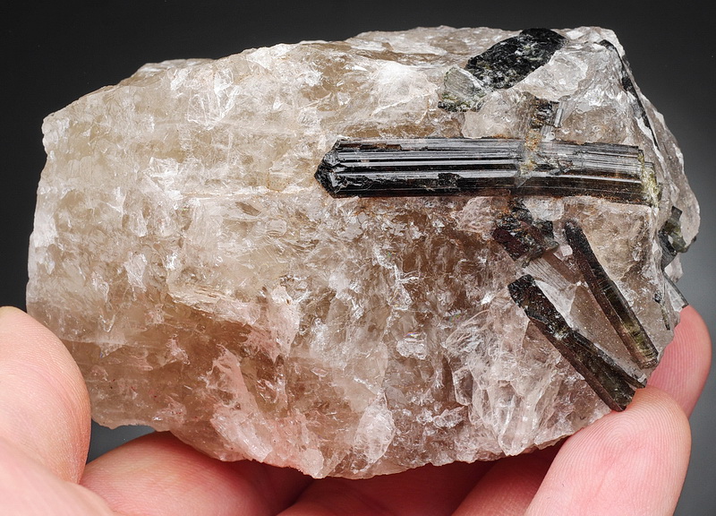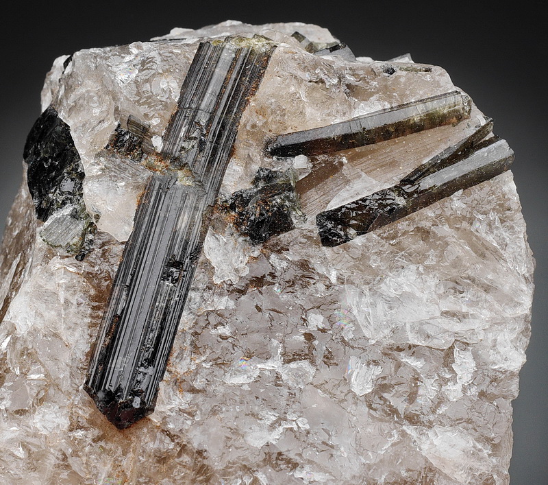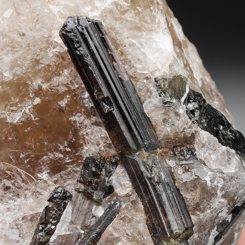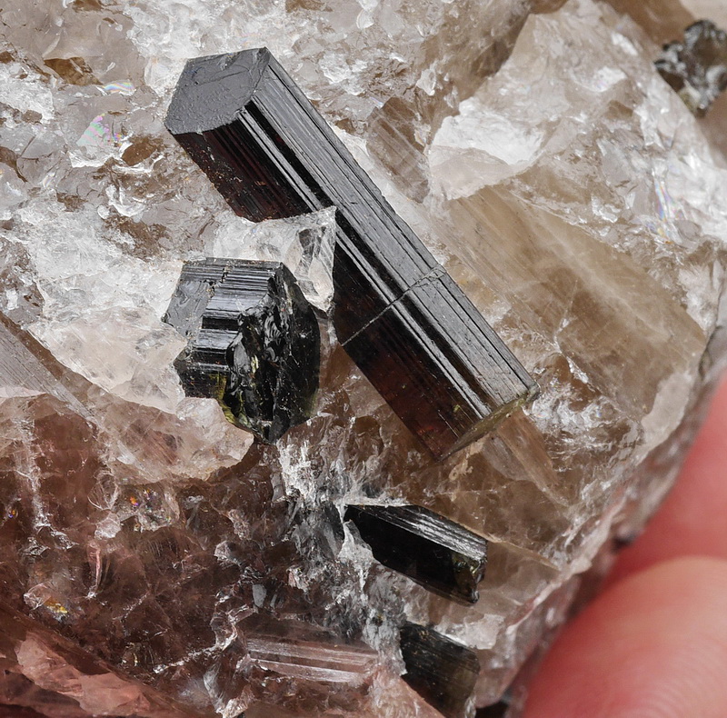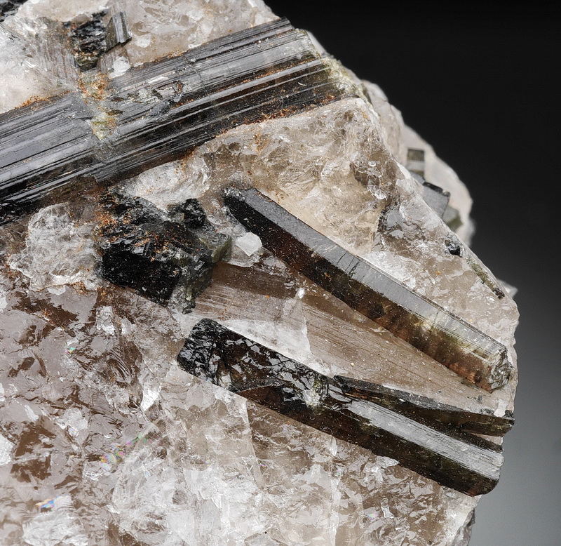 Błyszczące kryształy rzadkiej odmiany turmalinu - liddicoatytu - tkwiące w kwarcu.