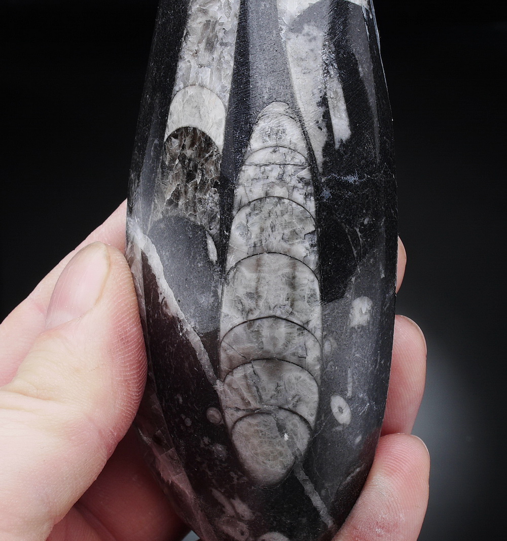 Polerowany okaz muszli / fragmokonu łodzika Orthoceras.
