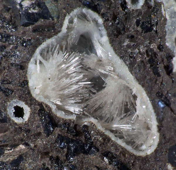 Szczotka błyszczących, igiełkowych kryształów natrolitu w w geodzie.