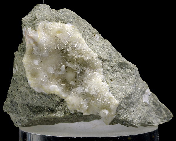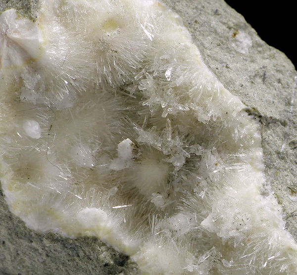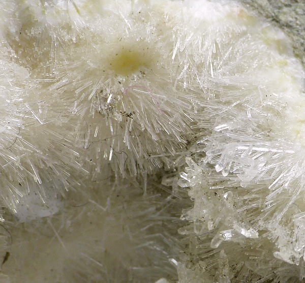 Szczotka błyszczących, igiełkowych kryształów natrolitu z apofyllitem w geodzie.