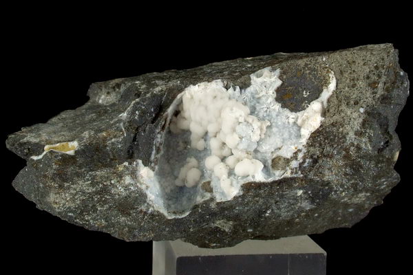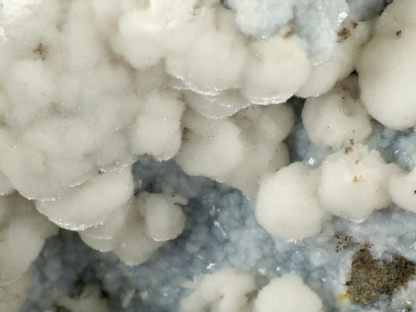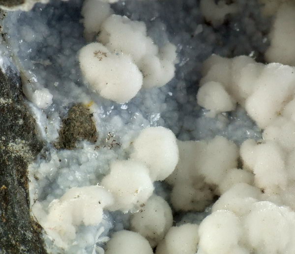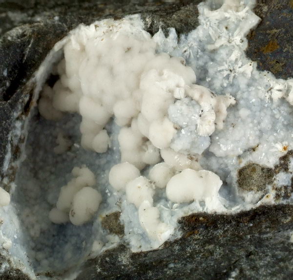 Białe kulki natrolitu osadzone na skupieniach phillipsytu.