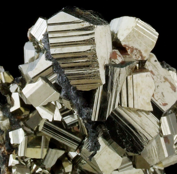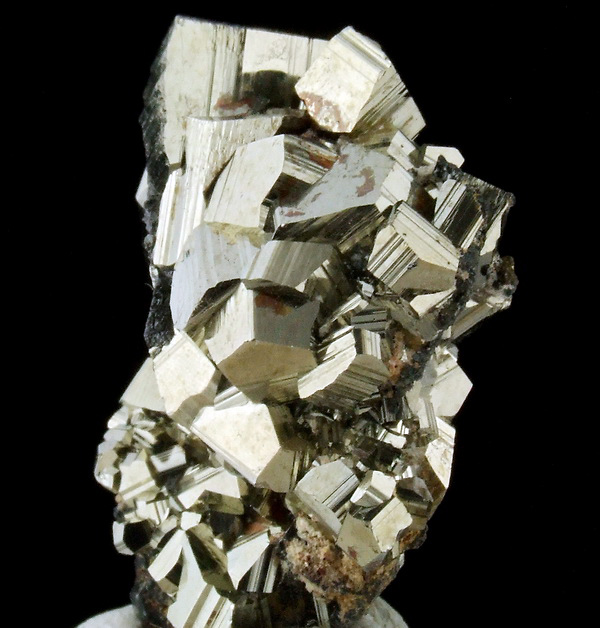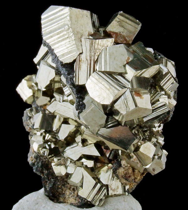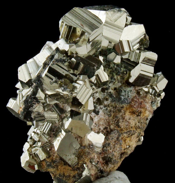 Efektowny zrost silnie błyszczących kryształów złocistego pirytu.