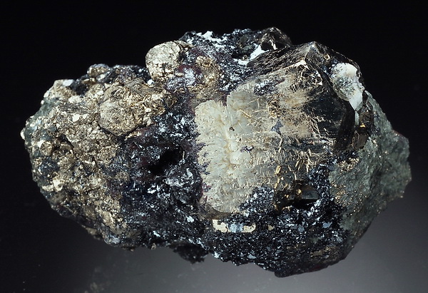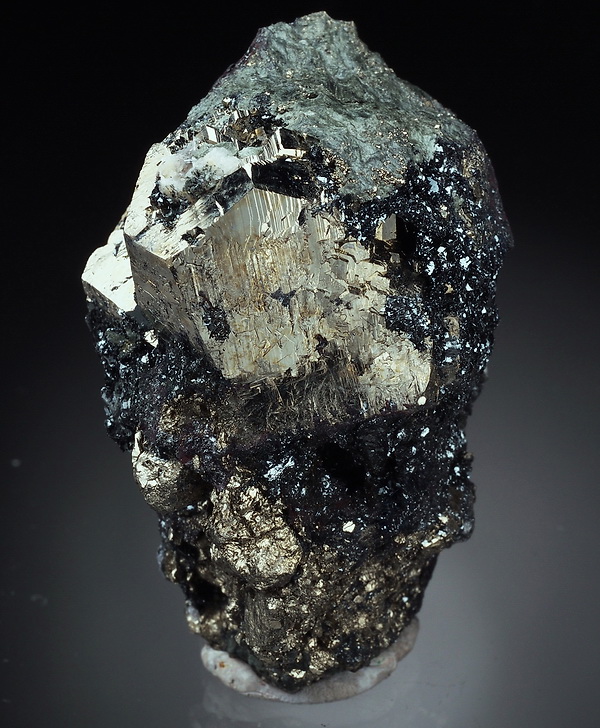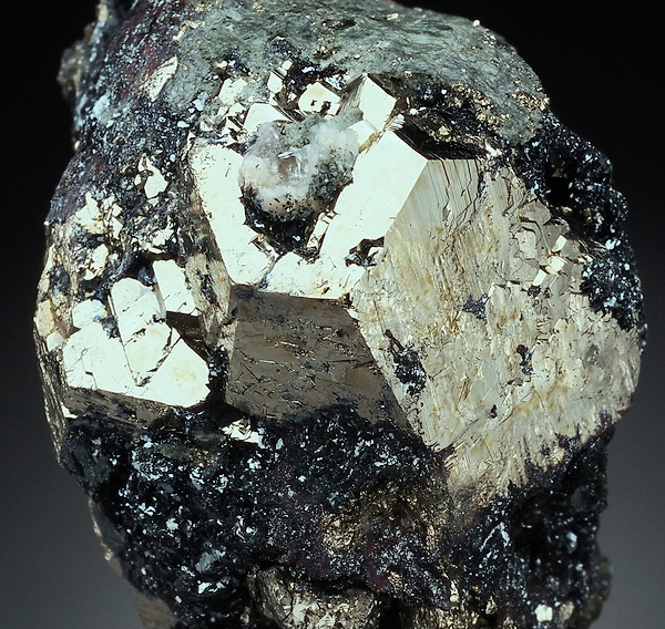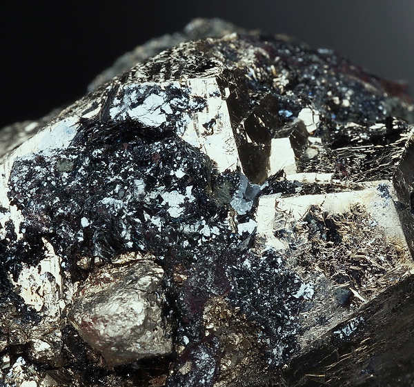 Bardzo błyszczący okaz złocistych kryształów pirytu z hematytem (błyszcz żelaza).
