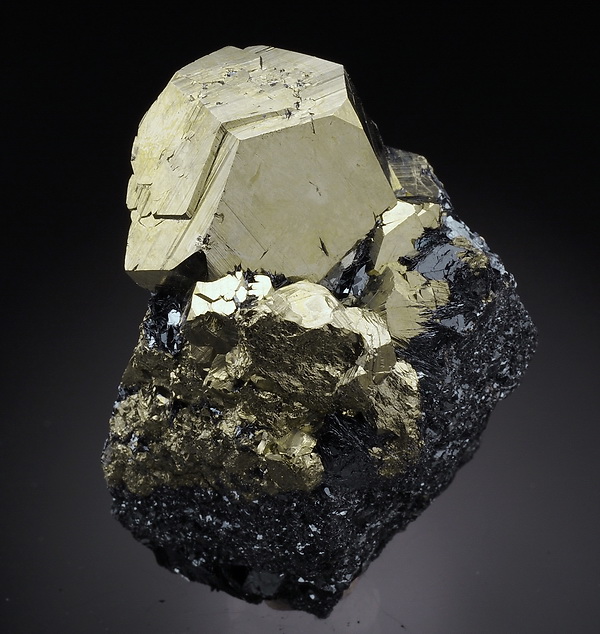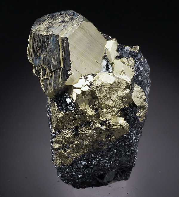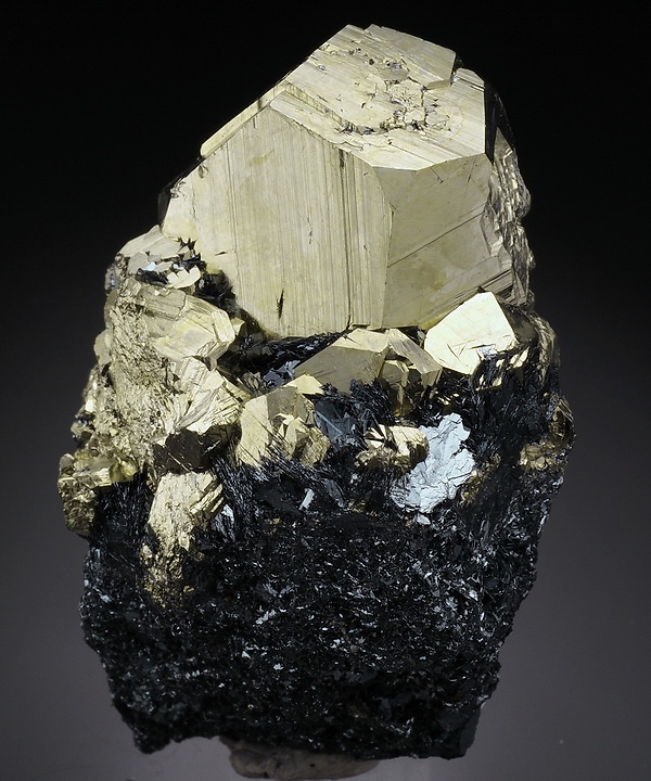 Bardzo błyszczący okaz złocistych kryształów pirytu z hematytem (błyszcz żelaza).