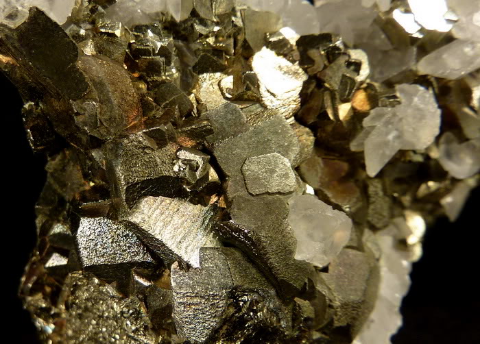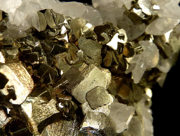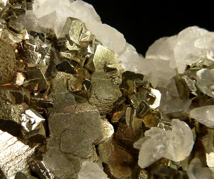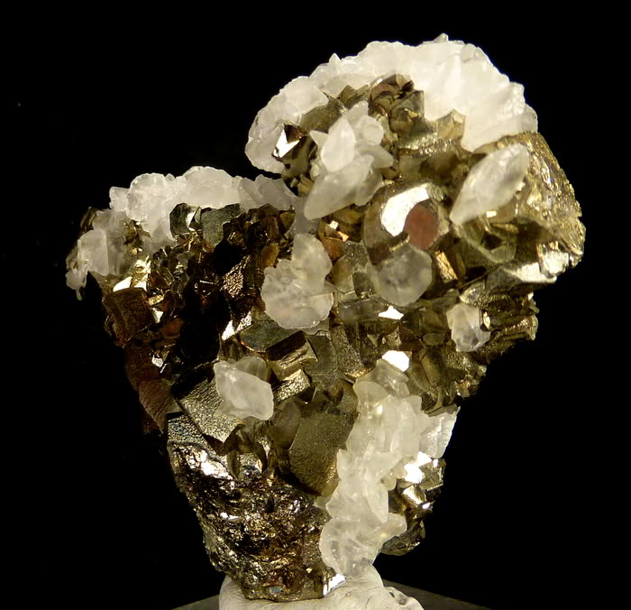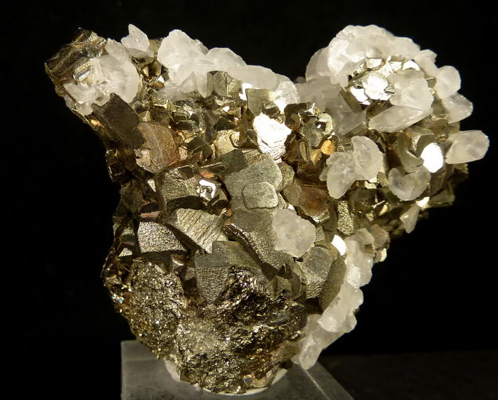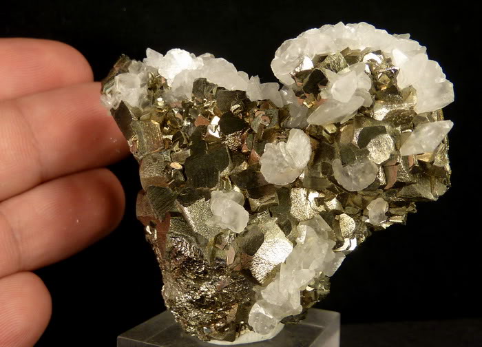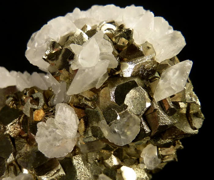 Ciekawy okaz dobrze wykształconych kryształow kalcytu na złocistym pirycie.