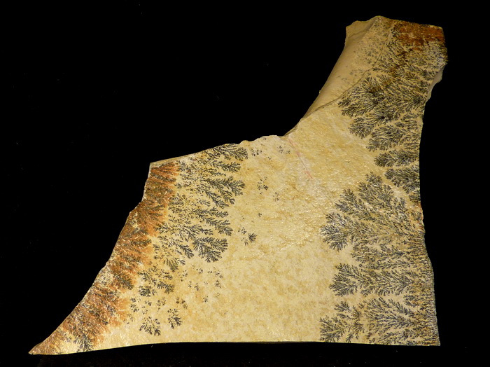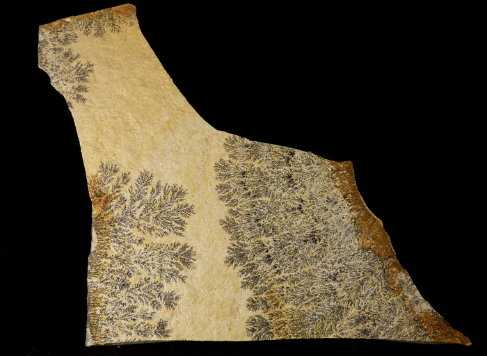 Ładna płyta górnojurajskiego wapienia litograficznego z pięknie wykrystalizowanymi dendrytami manganowymi (psylomelan) ze słynnego na całym świecie stanowiska w Bawarii.