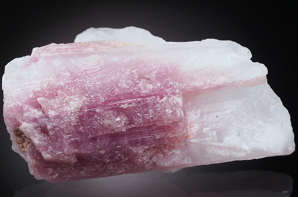 Kryształy błyszczącego różowego turmalinu - rubelitu osadzone w kwarcu.