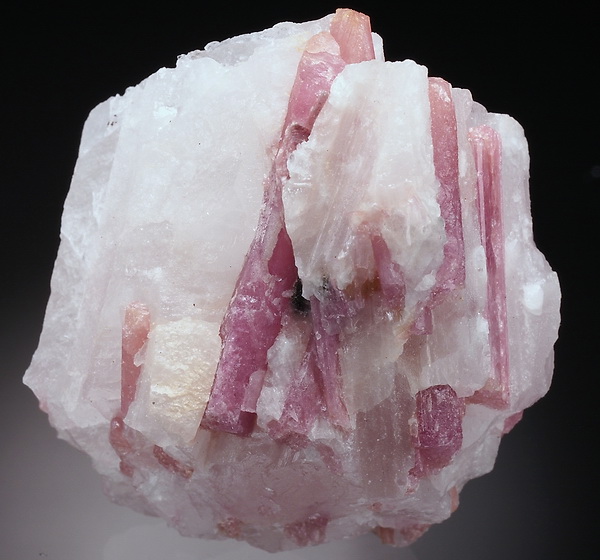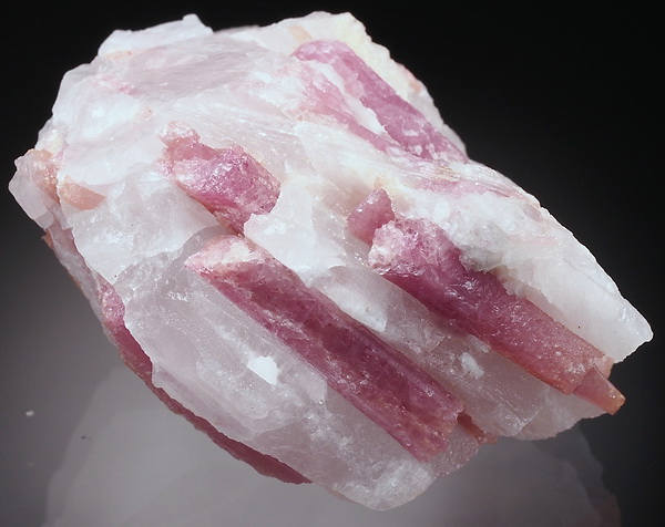 Kryształy błyszczącego różowego turmalinu - rubelitu osadzone w kwarcu.