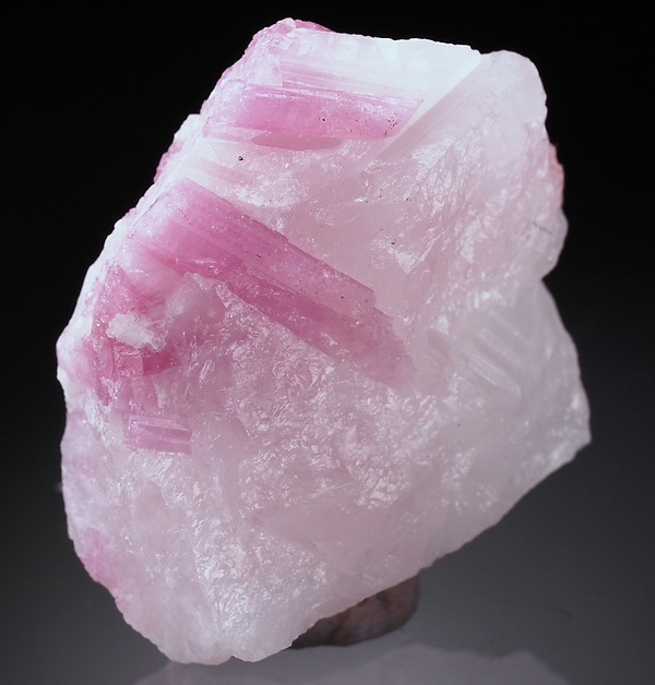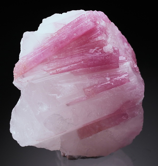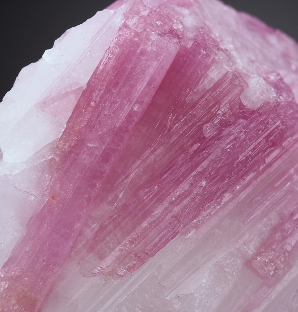 Kryształy błyszczącego różowego turmalinu - rubelitu osadzone w kwarcu.