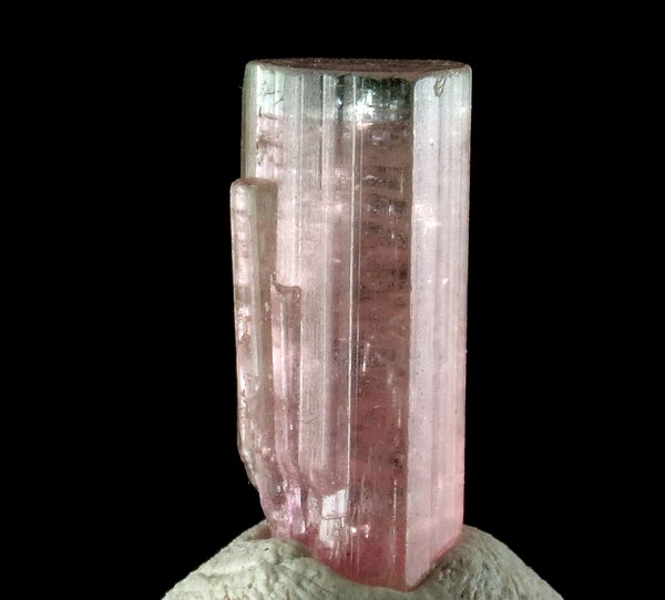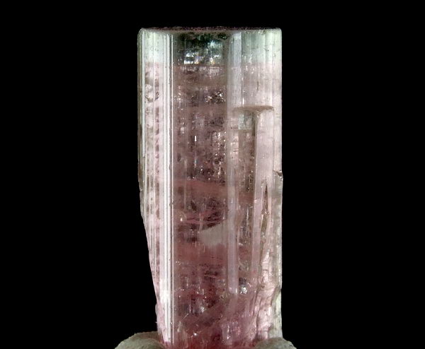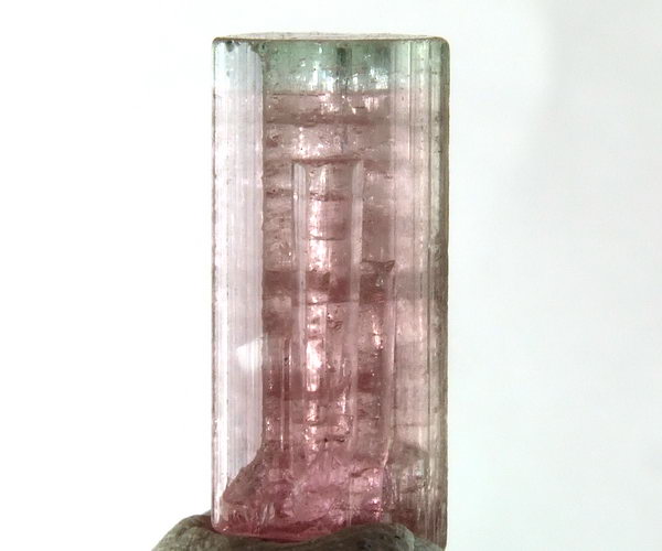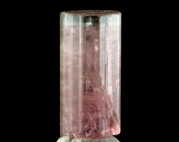 Idealnie wykształcony, o płaskim zakończeniu, silnie błyszczący kryształ różowej odmiany turamalinu - rubelitu, w górnej części różowa barwa przechodzi w jasnozieloną.