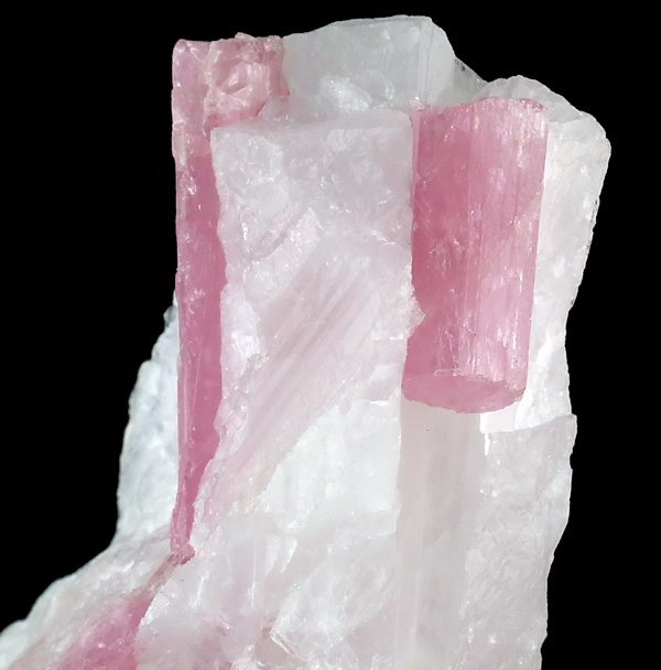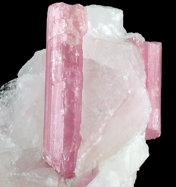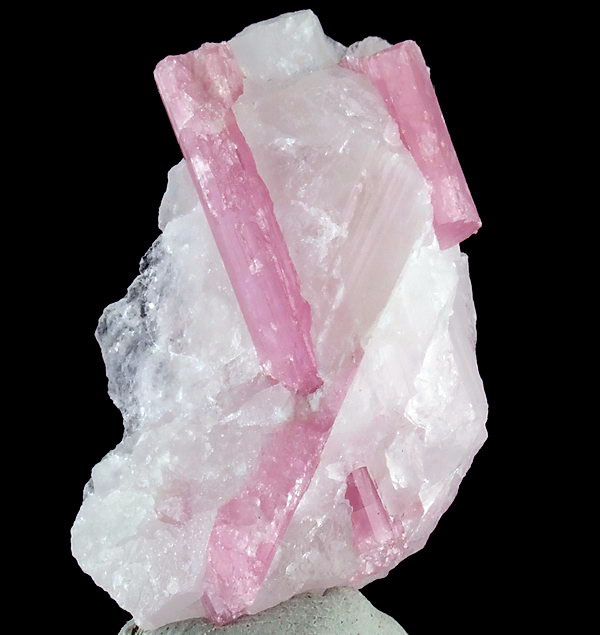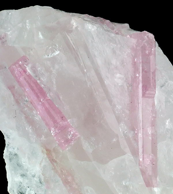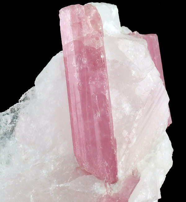 Kryształy błyszczącego rubelitu (turmalin) osadzone w kwarcu.