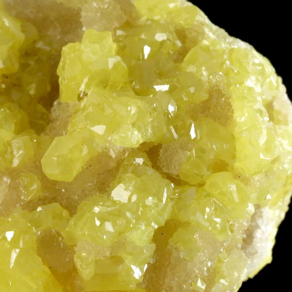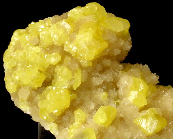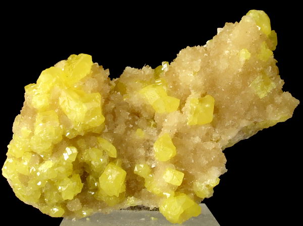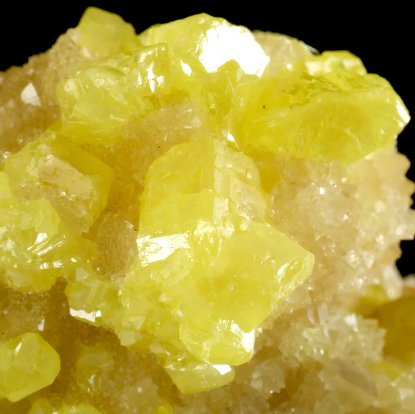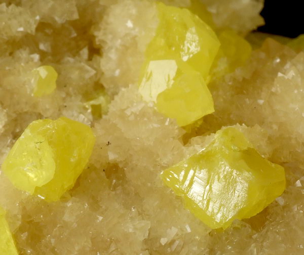 Dobrze wykształcone i silnie błyszczące kryształy siarki rodzimej na kalcycie z niedostępnej obecnie już lokalizacji.