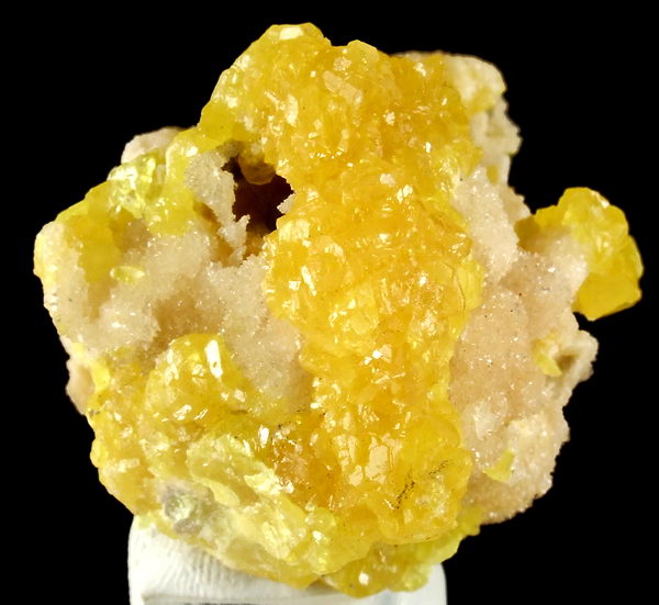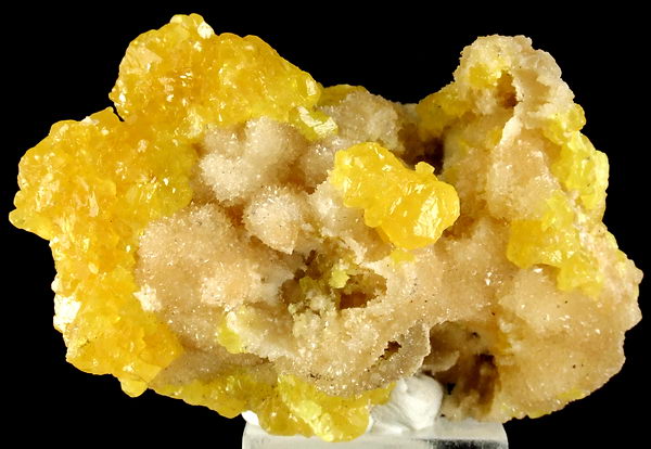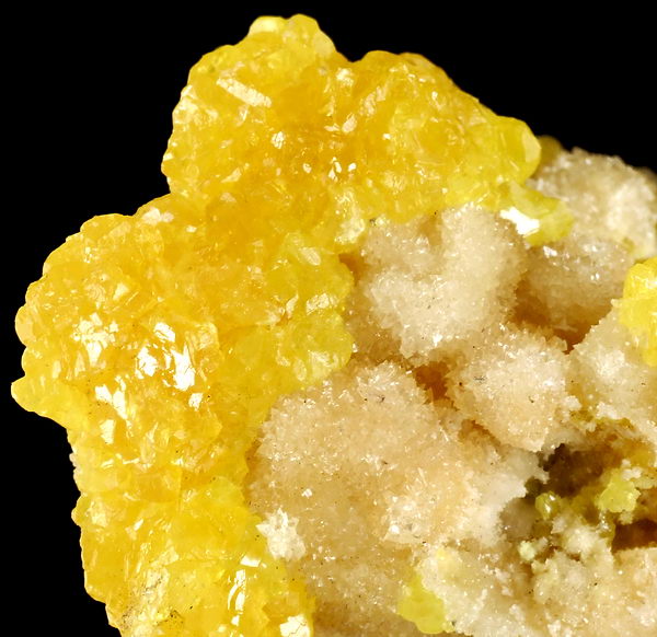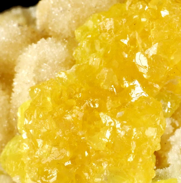 Intensywnie żółte kryształy siarki rodzimej na kalcycie,