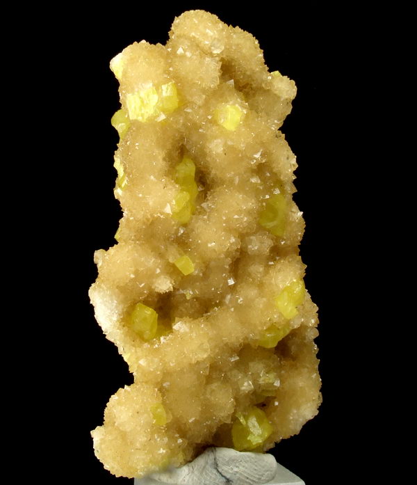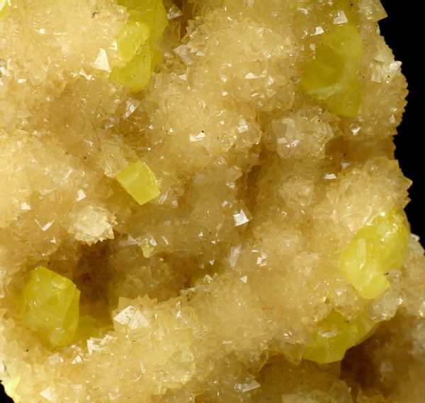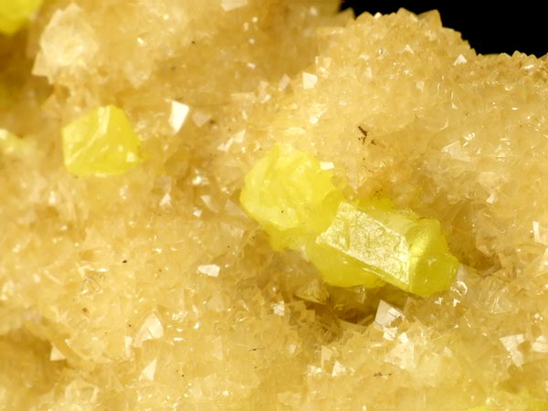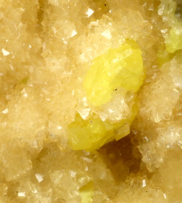 Kryształy siarki rodzimej na kalcycie z niedostępnej obecnie już lokalizacji.