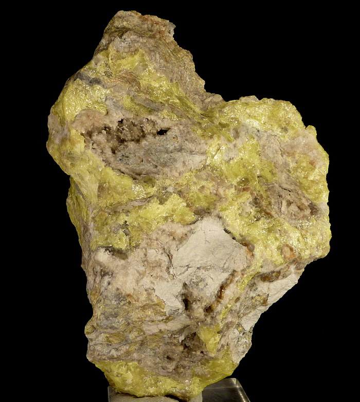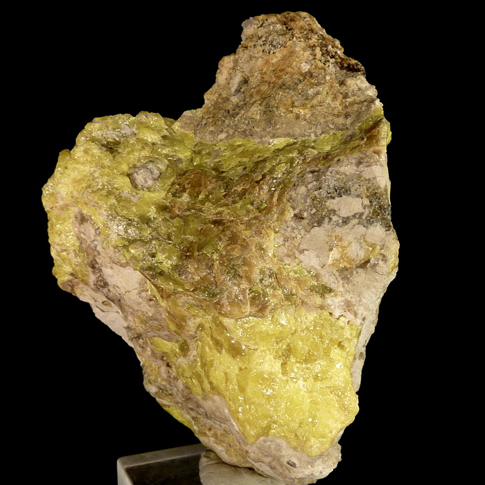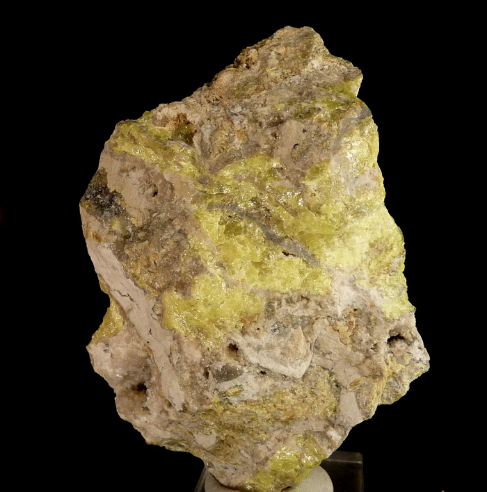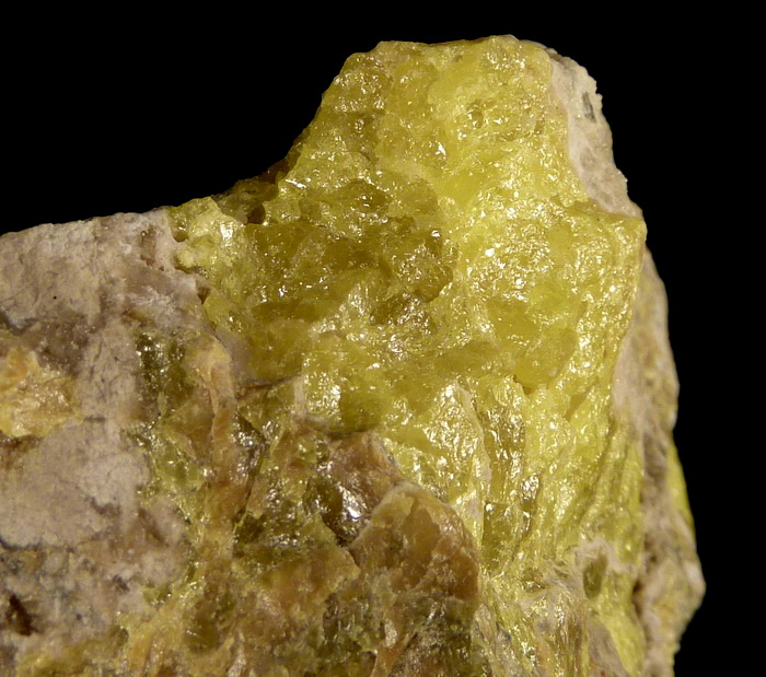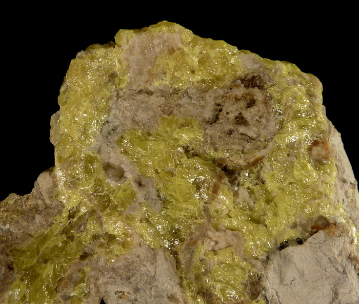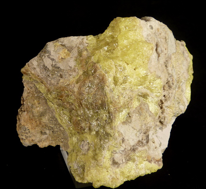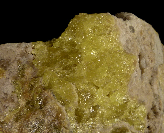 Skupienia siarki rodzimej o pięknej intensywnej żółtej barwie wraz z kalcytem na mioceńskim wapieniu siarkonośnym.
