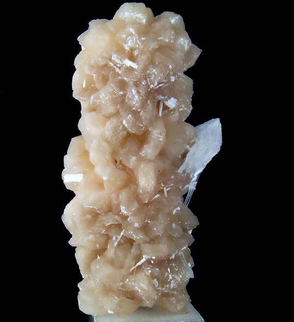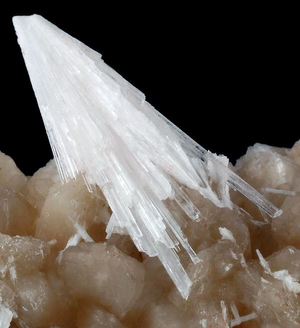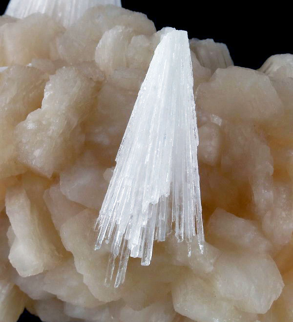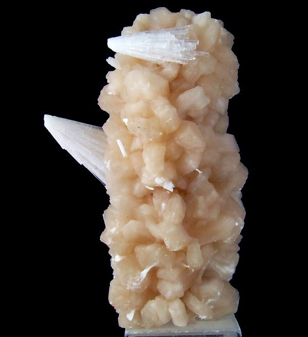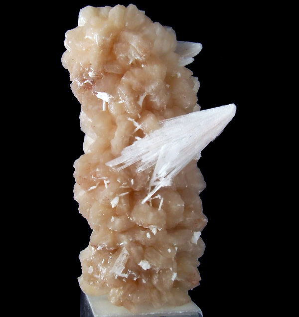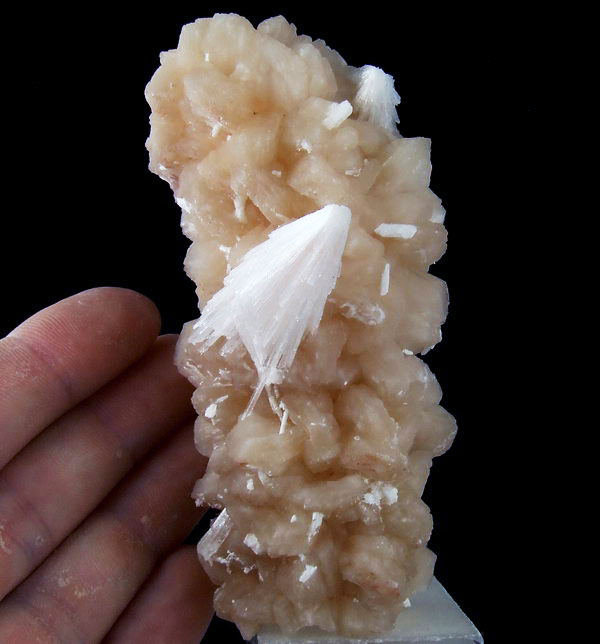 Ładny zrost kryształów stilbitu z białymi wiązkami błyszczących kryształów skolecytu.