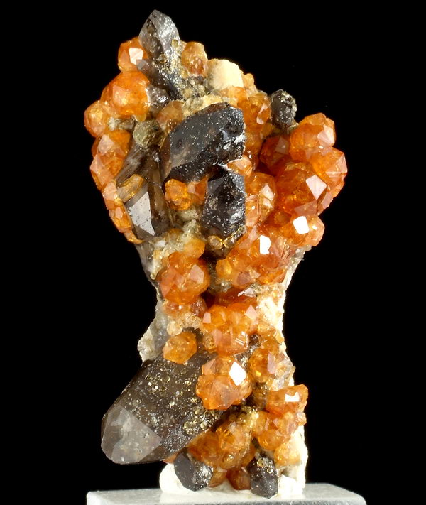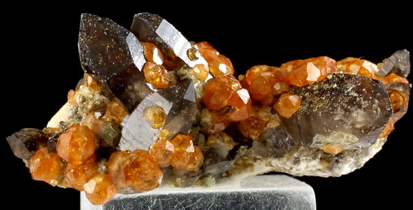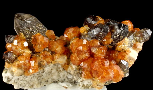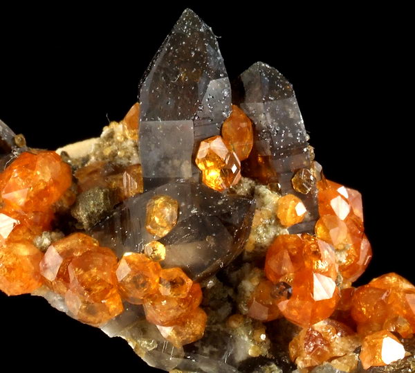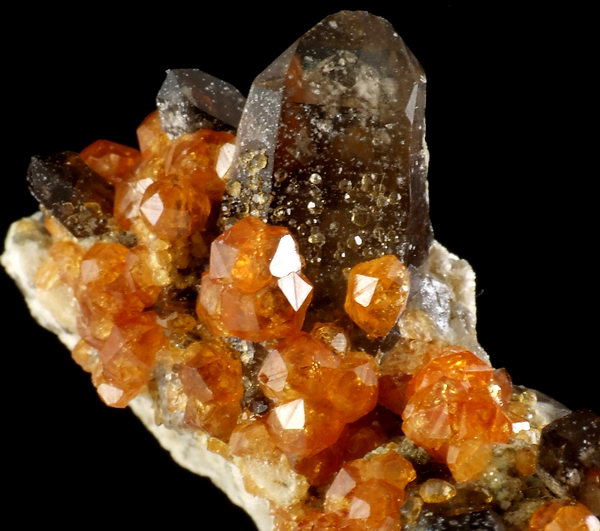Błyszczące kryształy spessartynu (grupa granatu) o pięknej barwie wraz z dobrze wykształconymi kryształami kwarcu dymnego.