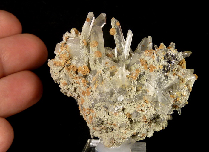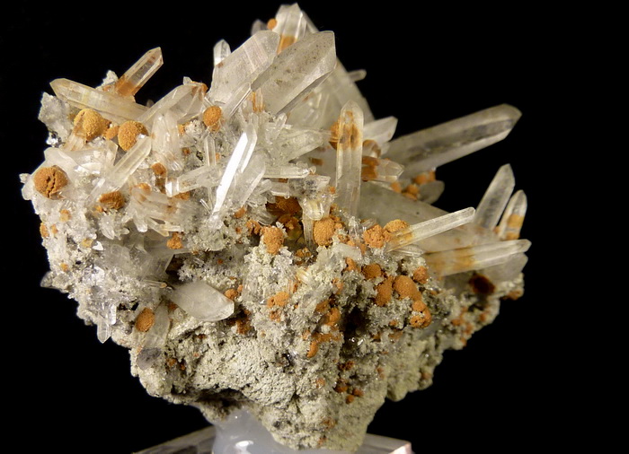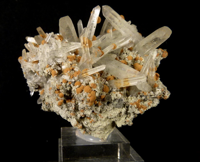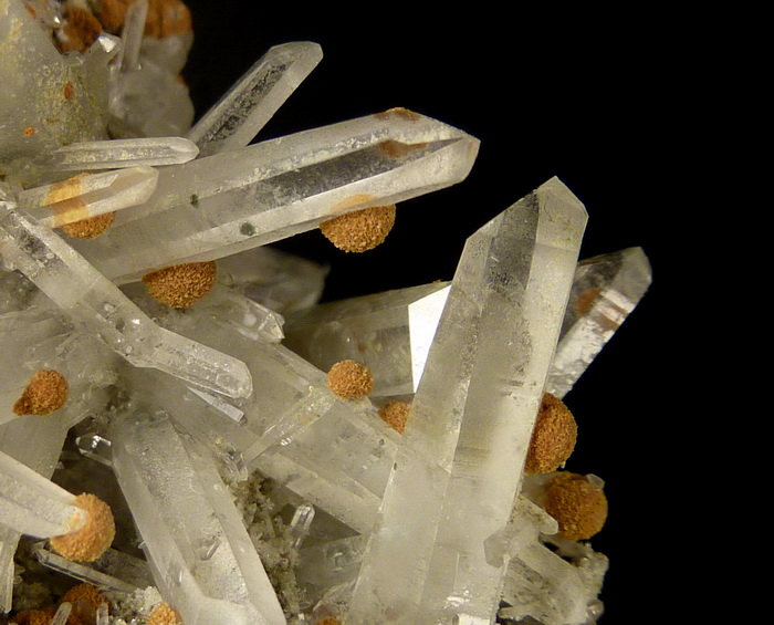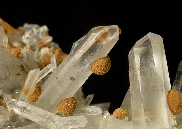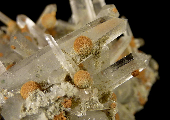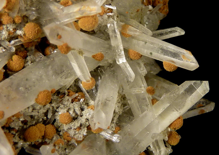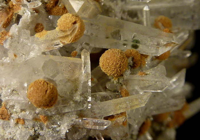 Efektowna szczotka kwarcowa z kulkami żółtobrązowego syderytu.