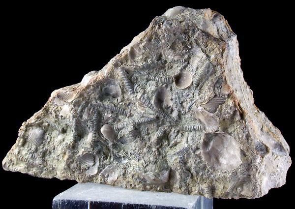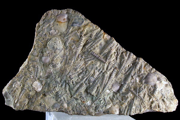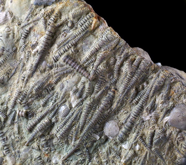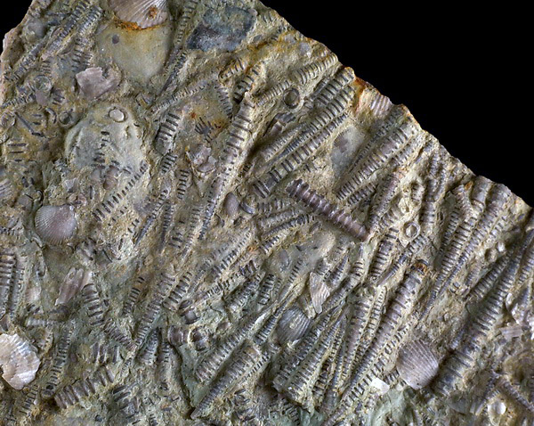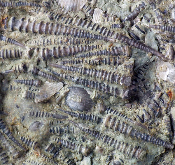 Liczne, bardzo dobrze zachowane dewońskie tentakulity wraz z brachiopodami na wapiennej płycie.