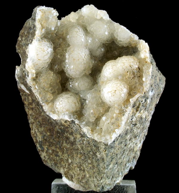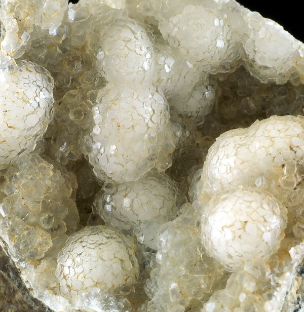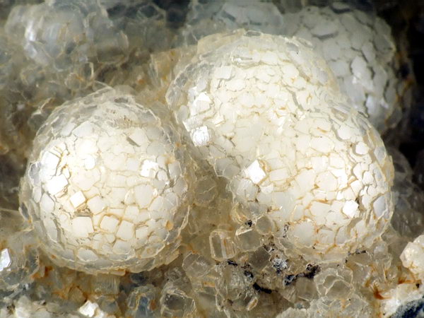Błyszczące, kuliste skupienia kryształów thomsonitu osadzone na matrixie w geodzie.