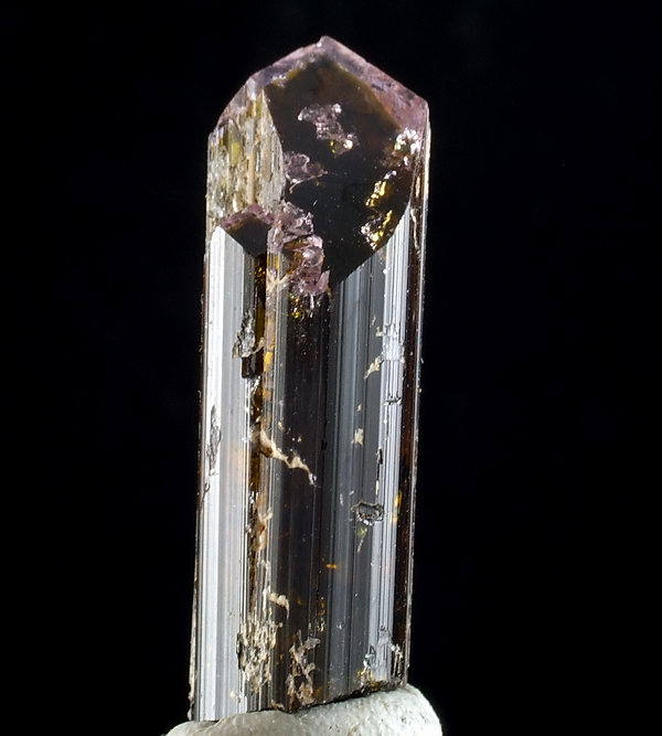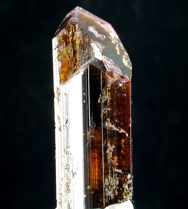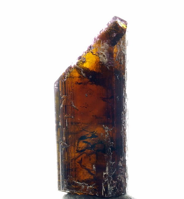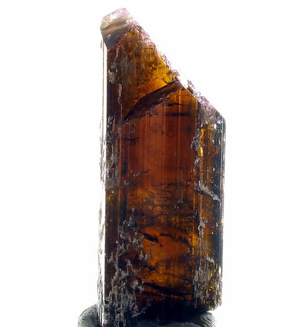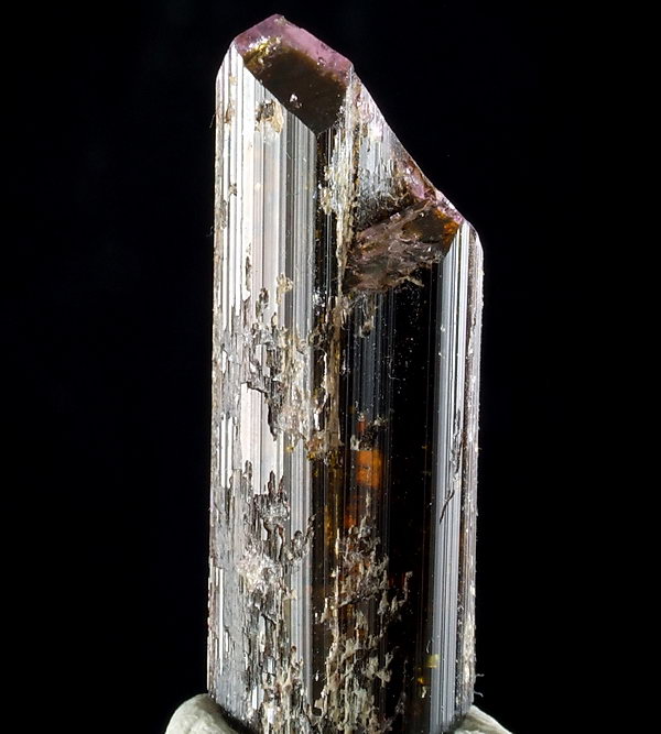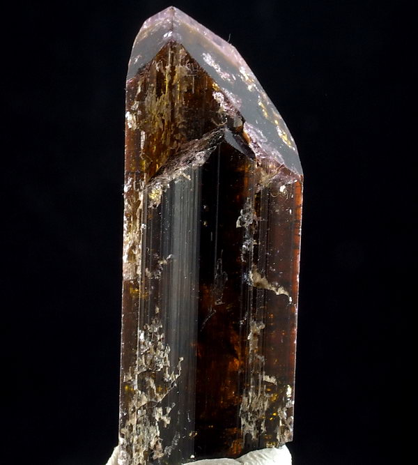 Dobrze wykształcony, błyszczący i lekko prześwitujący kryształ turmalinu.
