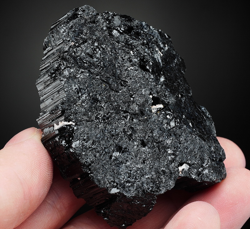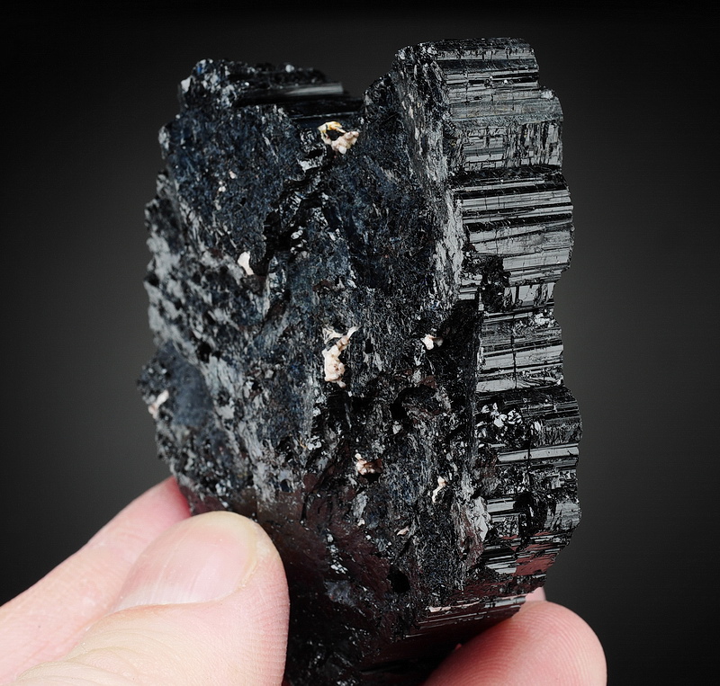 Błyszczący, wykształcony kryształ czarnego turmalinu.
