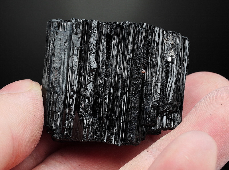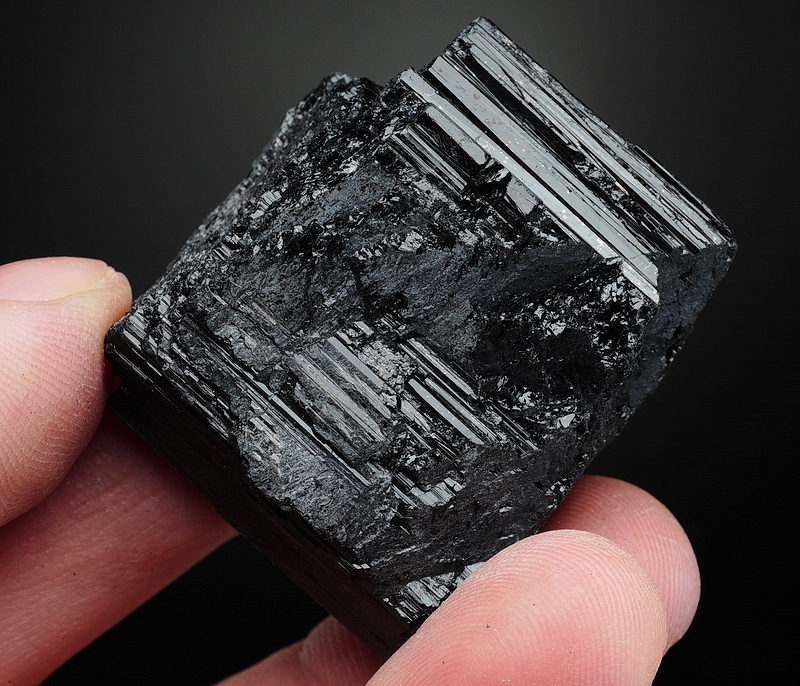 Błyszczący, wykształcony kryształ czarnego turmalinu.