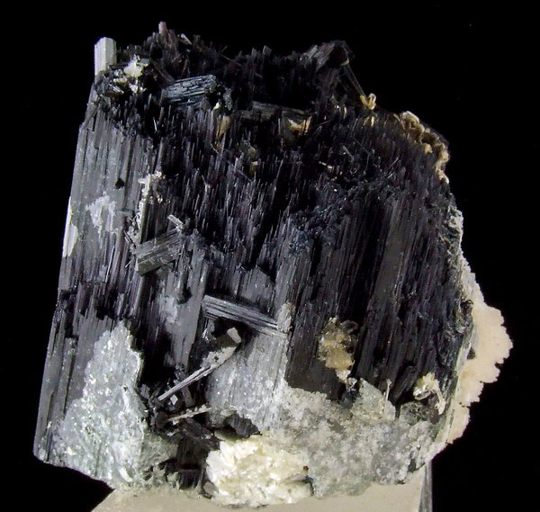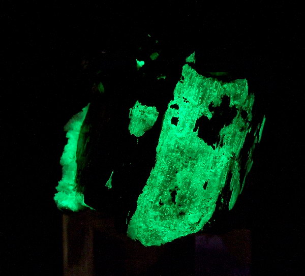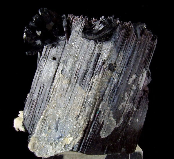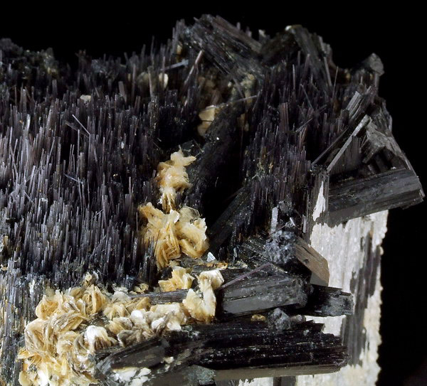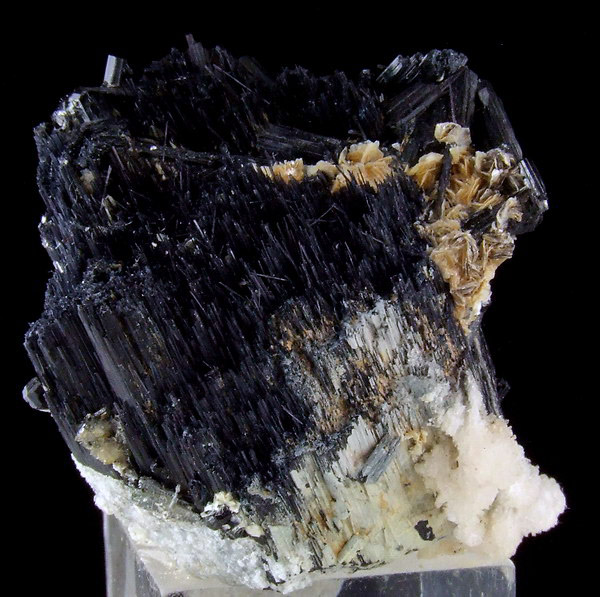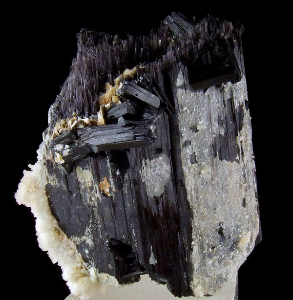 Błyszczący kryształ turmalinu z ciekawym wieloktronym zakończeniem w psotaci drobnych, igiełkowych kryształów. Okaz częściowo pokryty hialitem który bardzo silnie świeci w UV !!