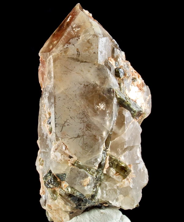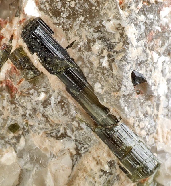 Kryształy kolorowego turmalinu osadzonego na krysztale kwarcu.