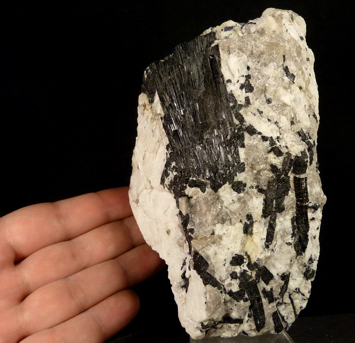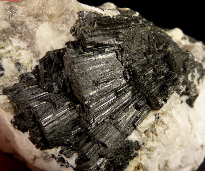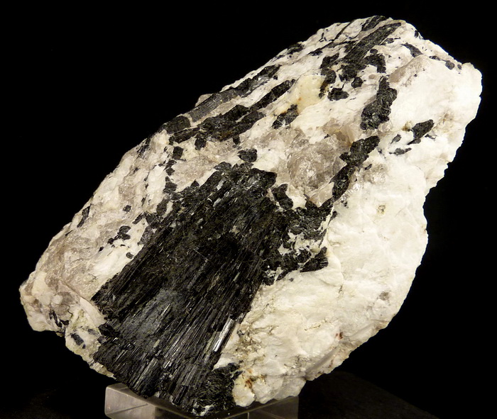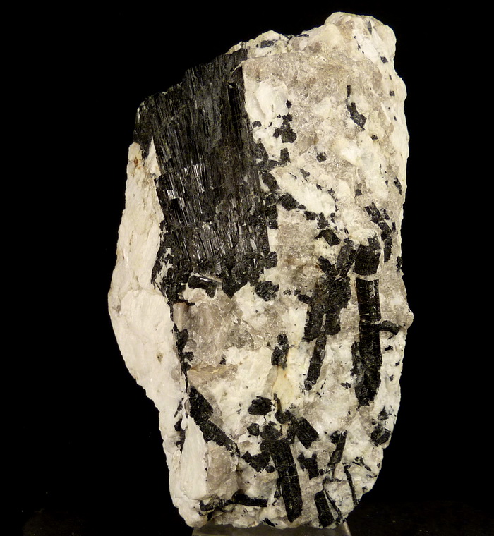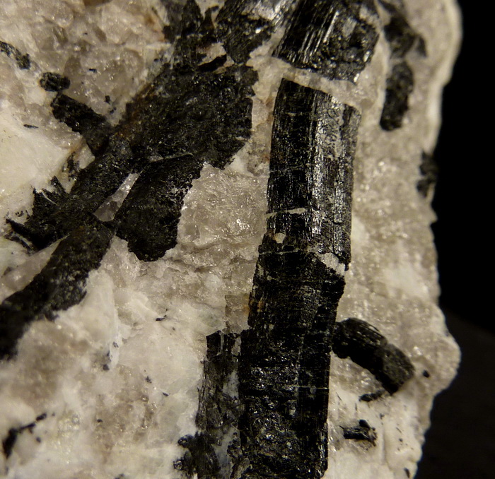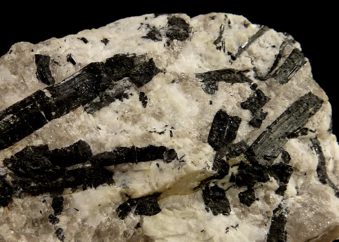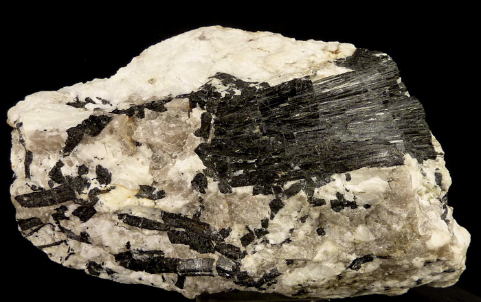 Efektowny, błyszczący zrost kryształów czarnego turmalinu (schörl) na pegmatycie (skaleń, kwarc) z kamieniołomu genejsu w Piławie (gnejsowa kra sowiogórska)