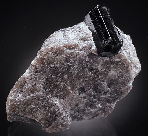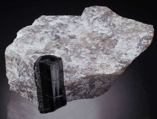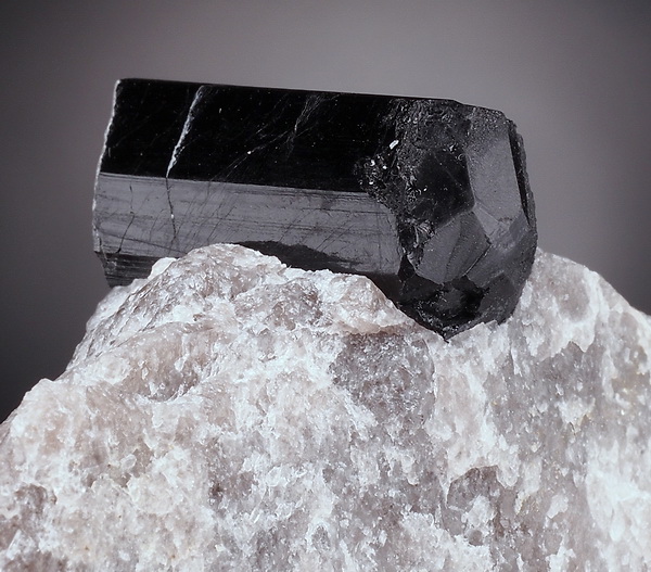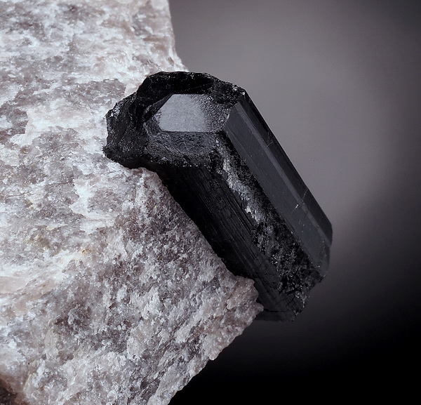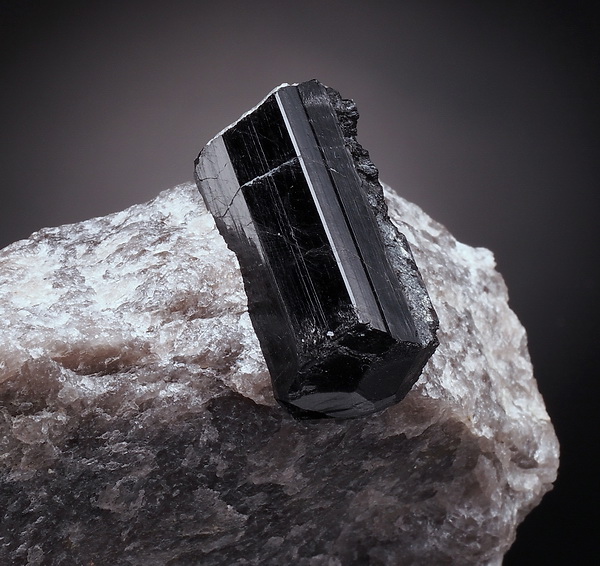 Kryształ czarnego turmalinu (szerl) o błyszczących, prążkowanych ścianach osadzony w kwarcu.