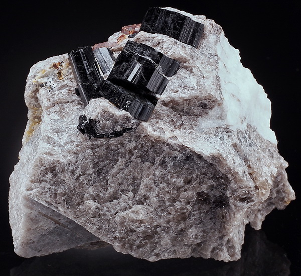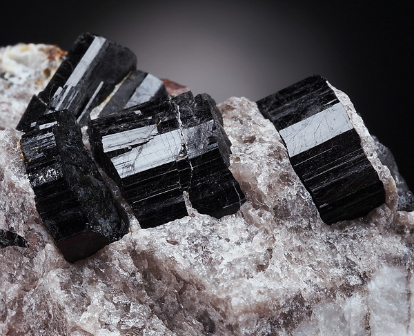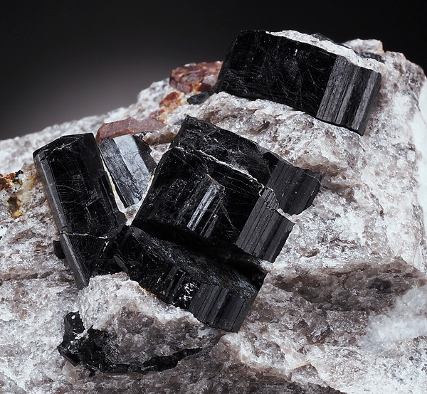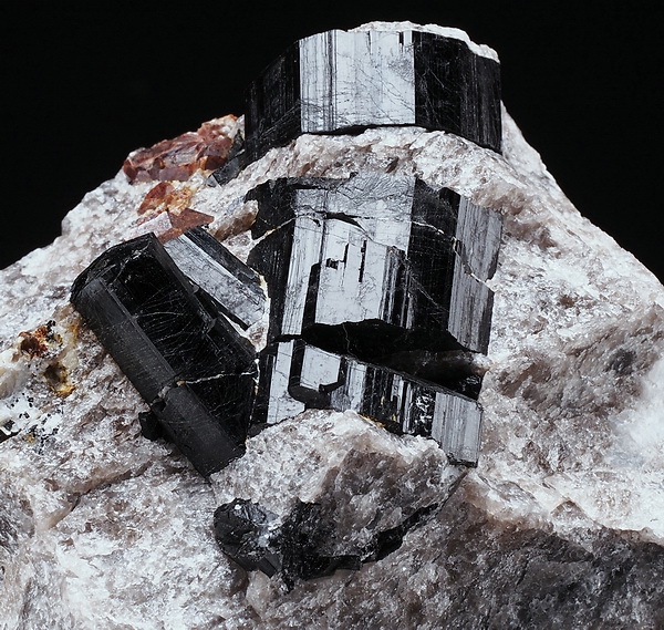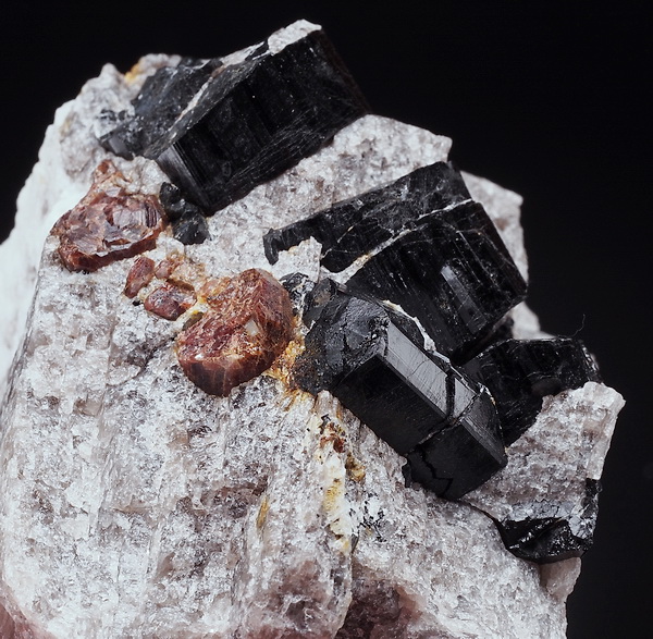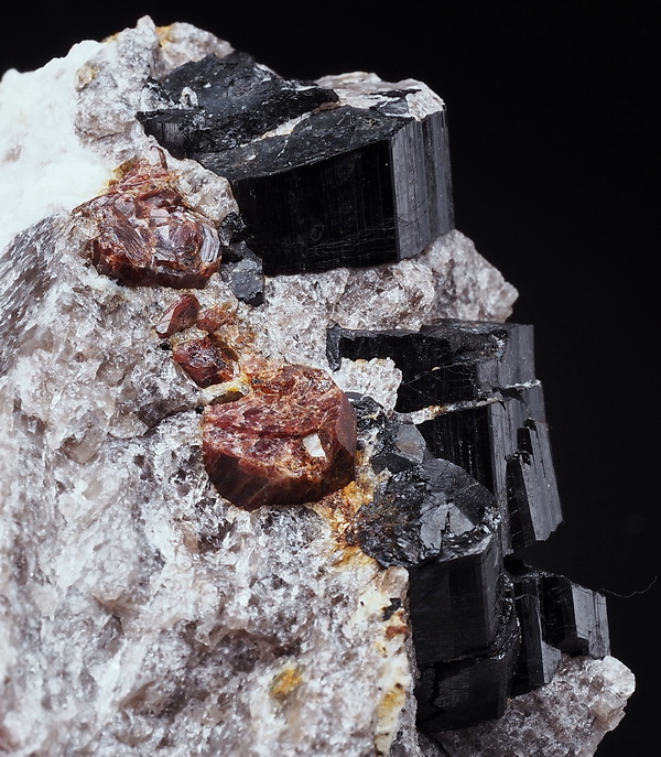 Kryształy czarnego turmalinu (szerl) o błyszczących, prążkowanych ścianach w towarzystwie granatu osadzone w kwarcu.