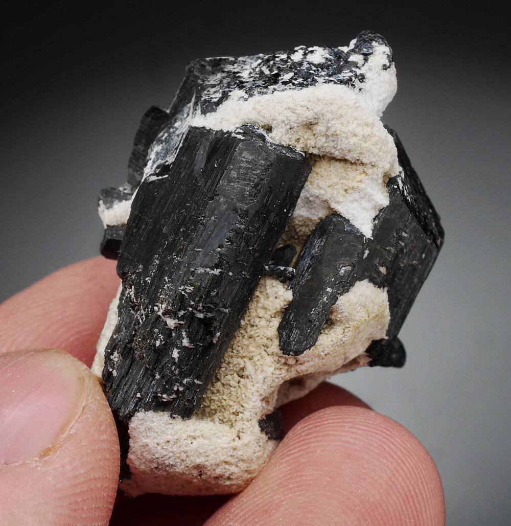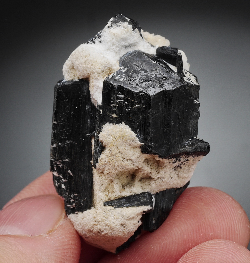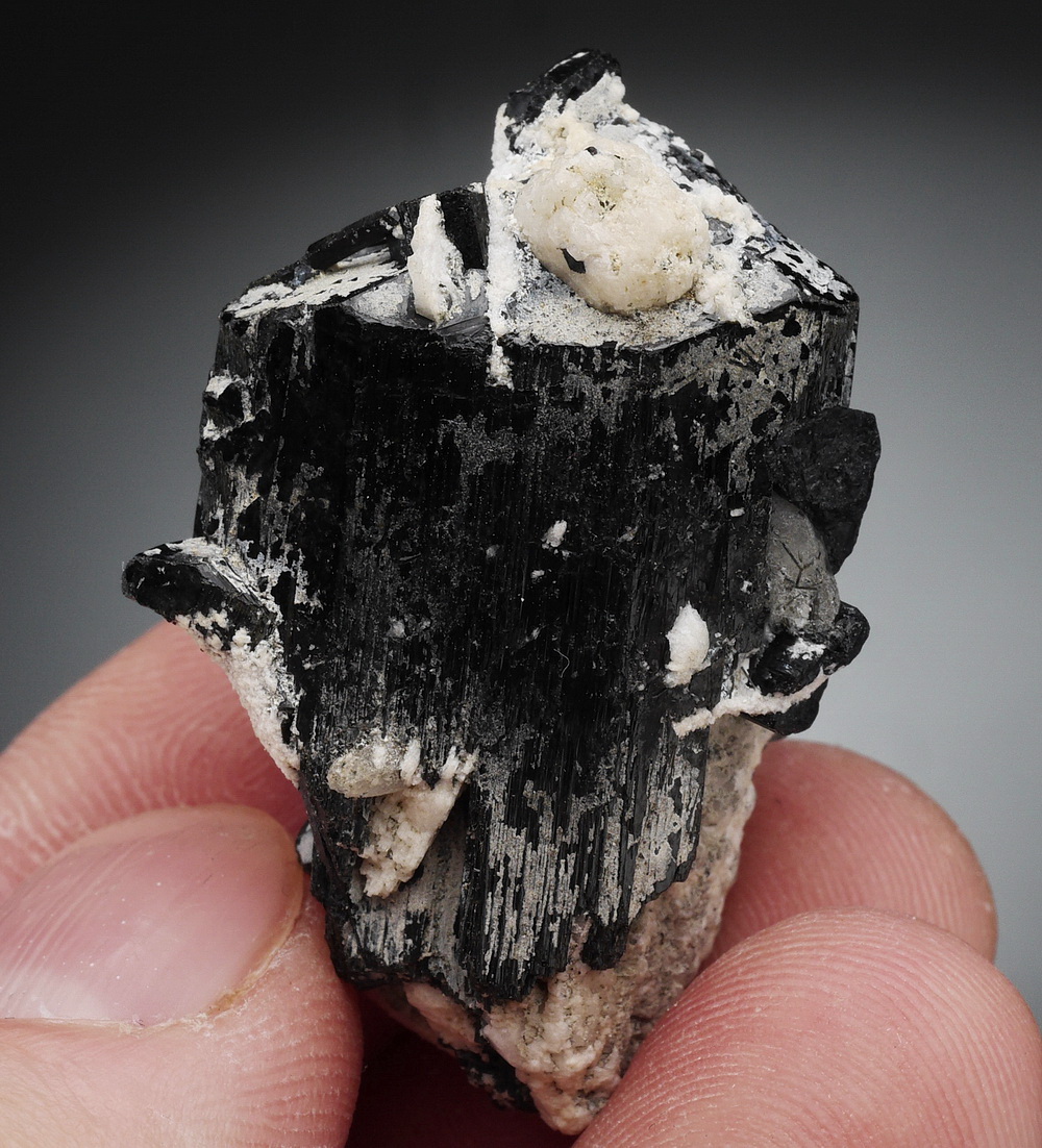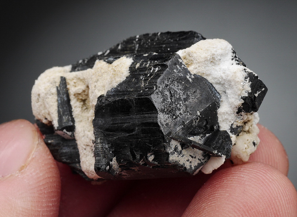 Bardzo błyszczący i dobrze wykształcony, duży kryształ czarnego turmalinu (szerl) .