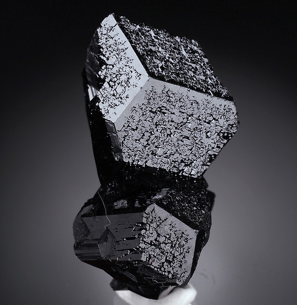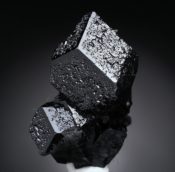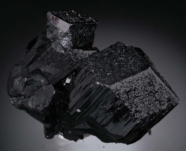 Zrost bardzo błyszczących kryształów czarnego turmalinu (szerl) .