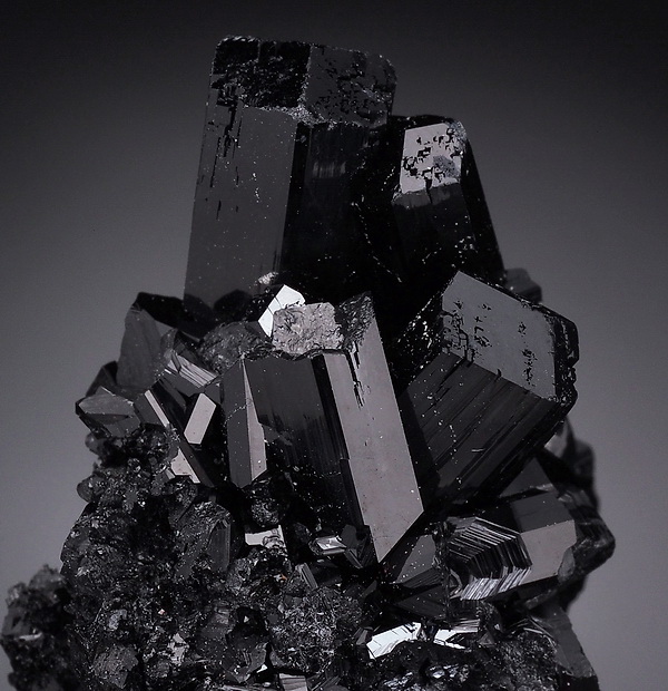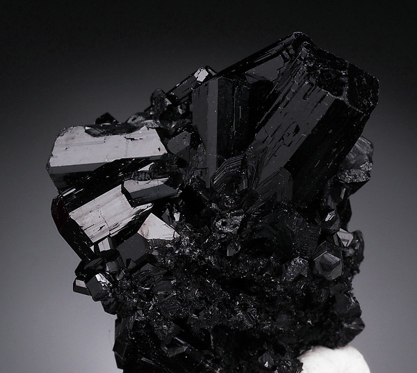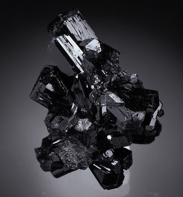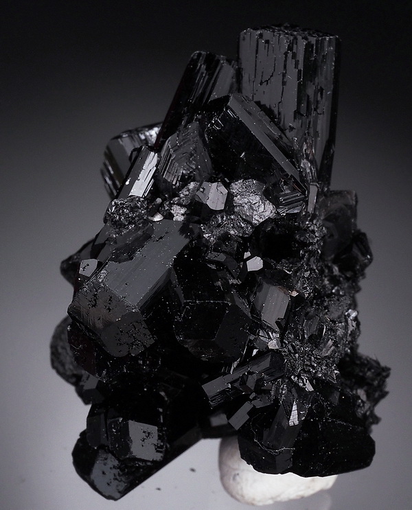 Zrost bardzo błyszczących kryształów czarnego turmalinu (szerl) .