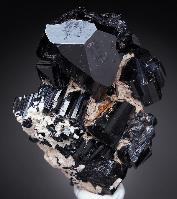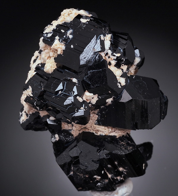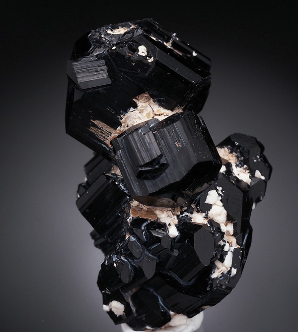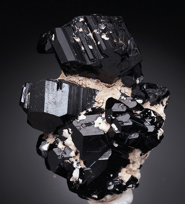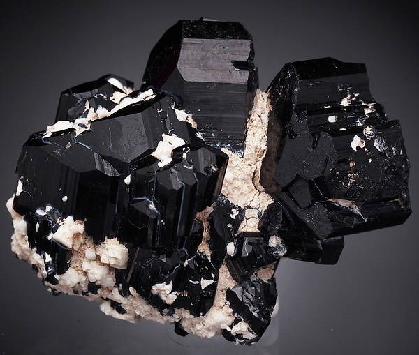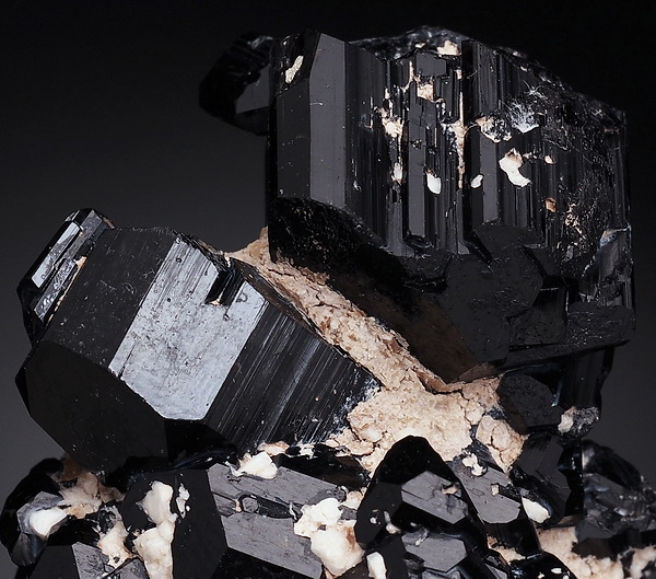 Zrost bardzo błyszczących kryształów czarnego turmalinu (szerl) .